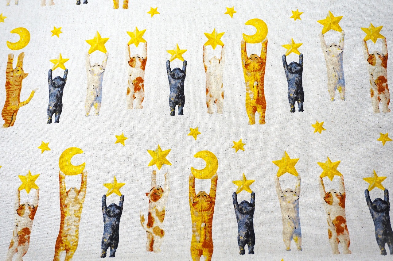 星や月を背伸びしながらガシっとキャッチしているネコちゃん達の姿がとても可愛い柄で、バッグに使用すると大人可愛いバッグになりました。
