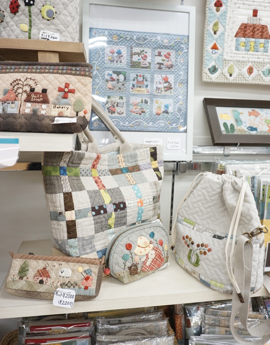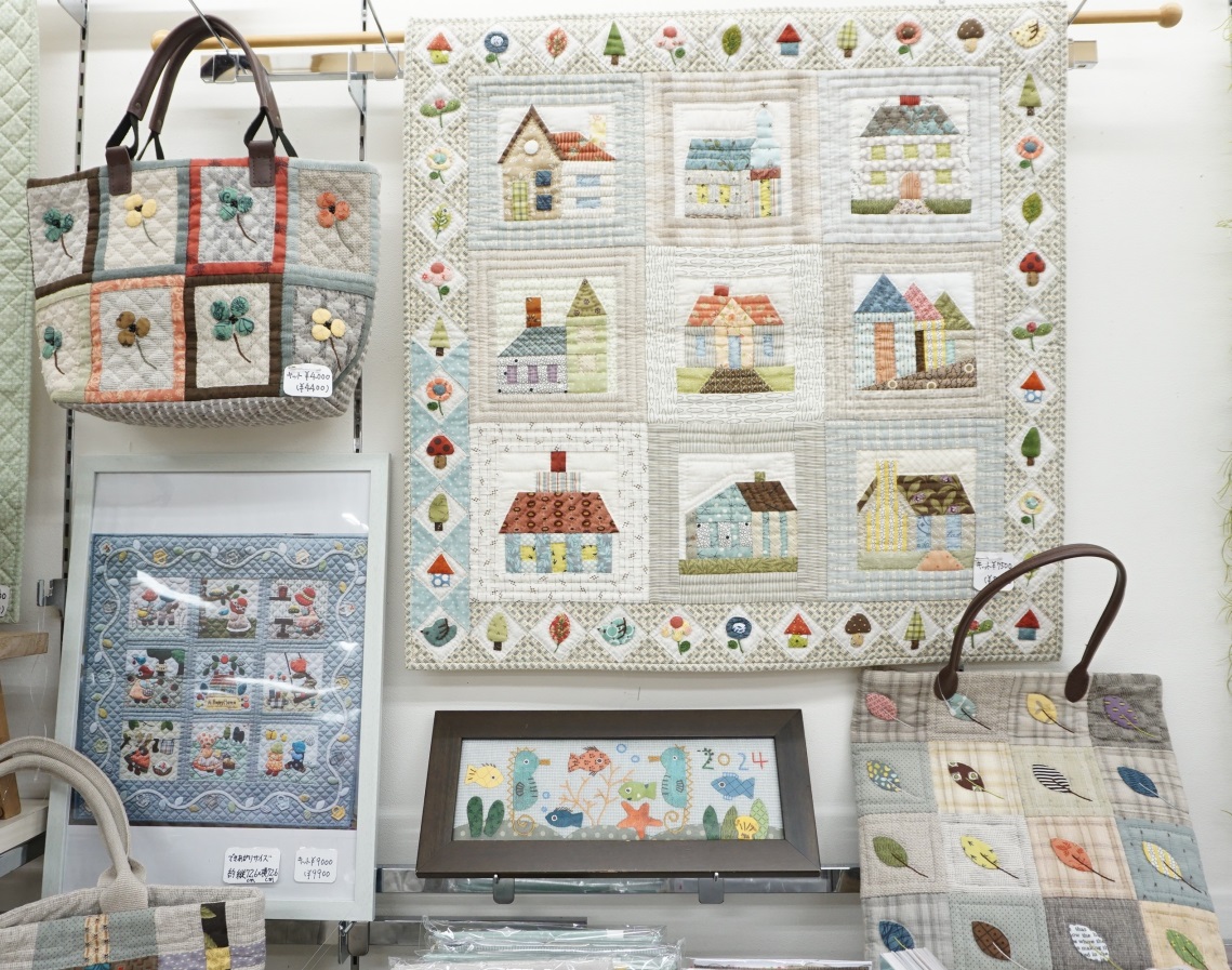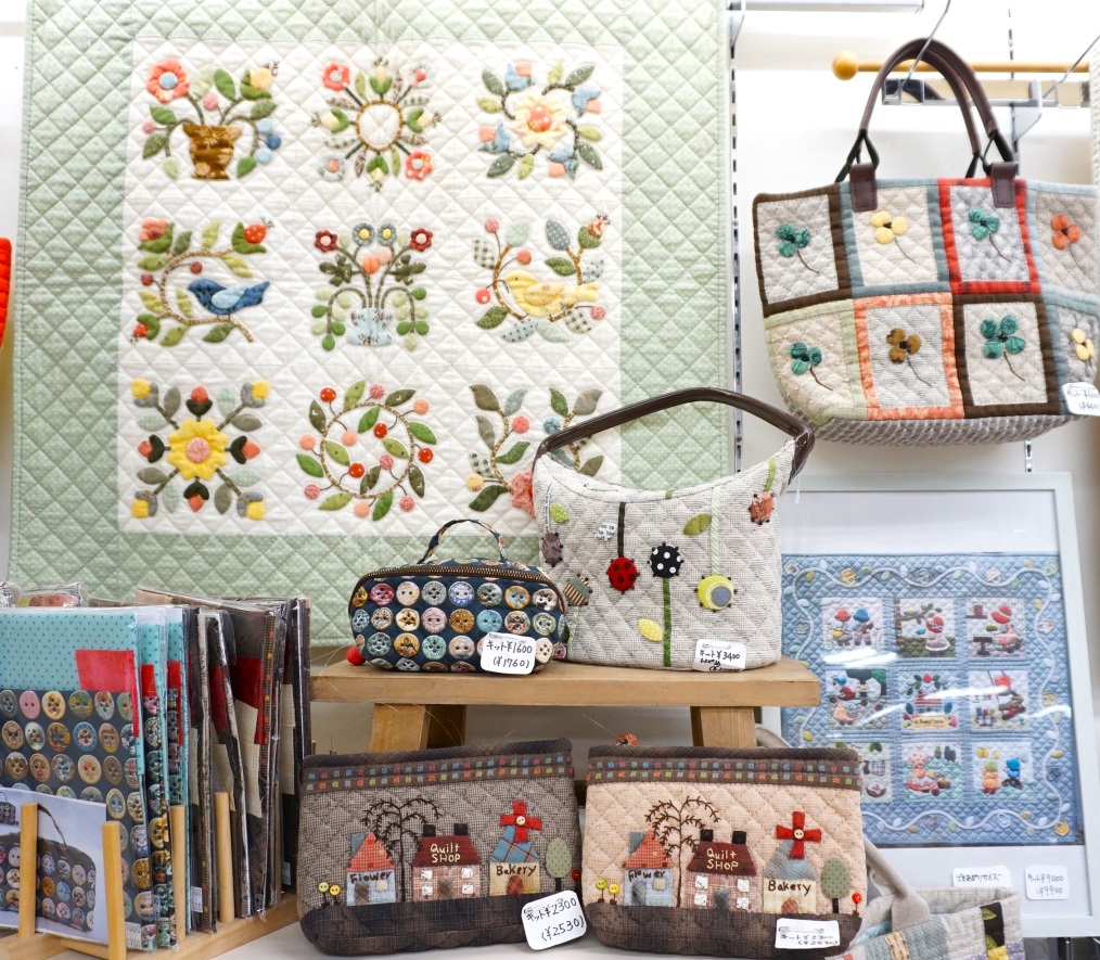 力作揃いのタペストリー・バッグ・ポーチ等、アメリカンキルトらしさを感じさせ、デザイン・色使いがナチュラルで可愛らしさがあります。