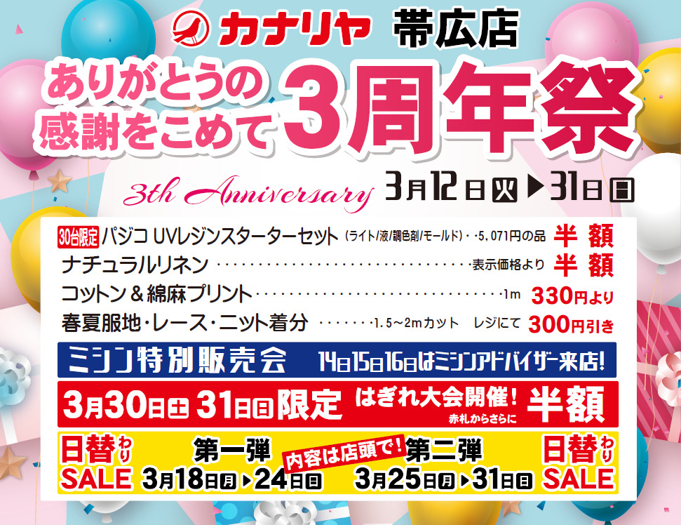 2024年3月12日(火)~31日(日)までの期間、カナリヤ帯広店にて ありがとうの感謝をこめて「3周年祭」を開催致します。(終了致しました)