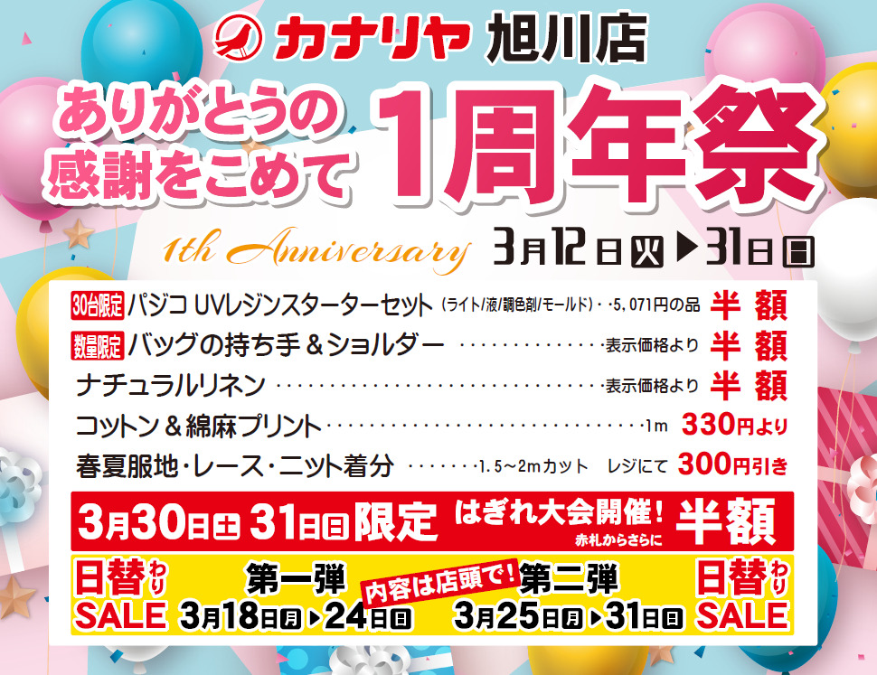 2024年3月12日〜3月31日(日)までの期間、カナリヤ旭川店ではありがとうの感謝をこめて「1周年祭」を開催致します。(終了致しました)