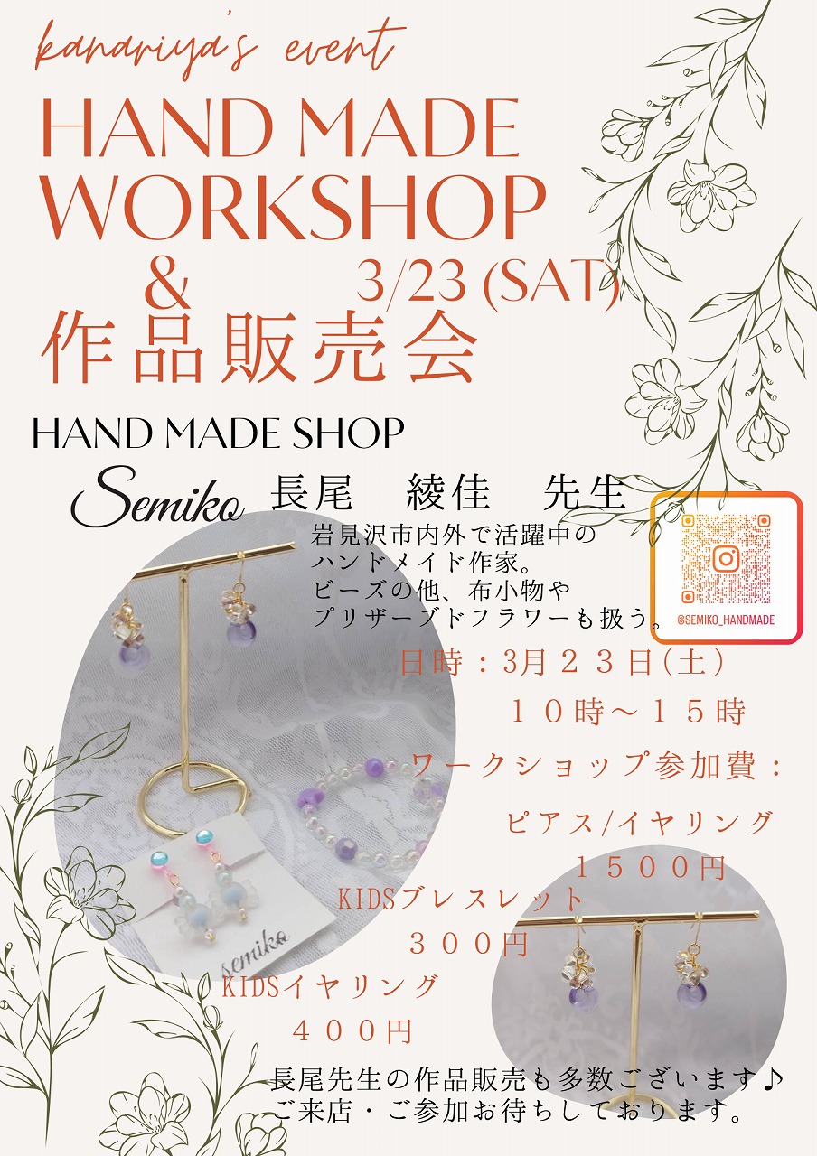 2024年3月23日(土)、カナリヤ岩見沢店にて「HAND MADE WORKSHOP&作品販売会」を開催致します。(終了致しました)