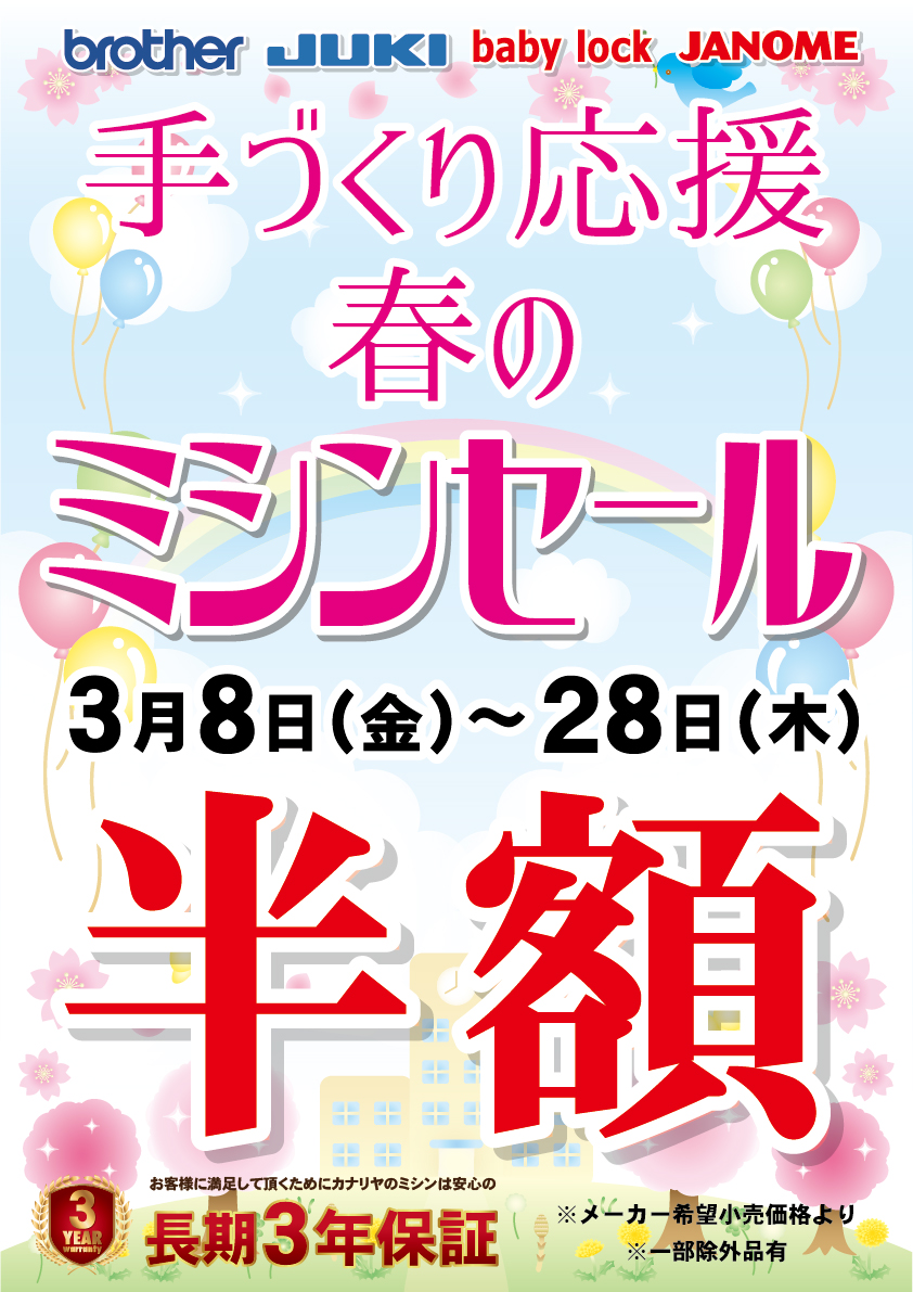 2024年3月8日(金)~28日(木)迄の期間、カナリヤ本店3階ミシンコーナーにて、「手づくり応援 春のミシンセール」を開催致します。(終了致しました)