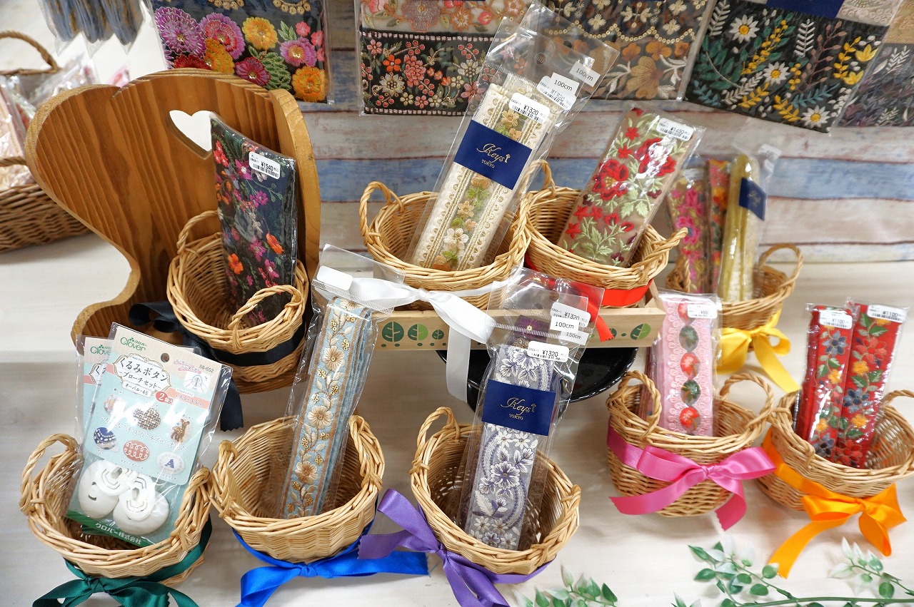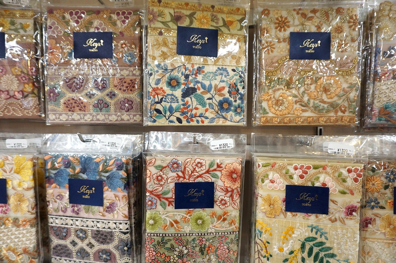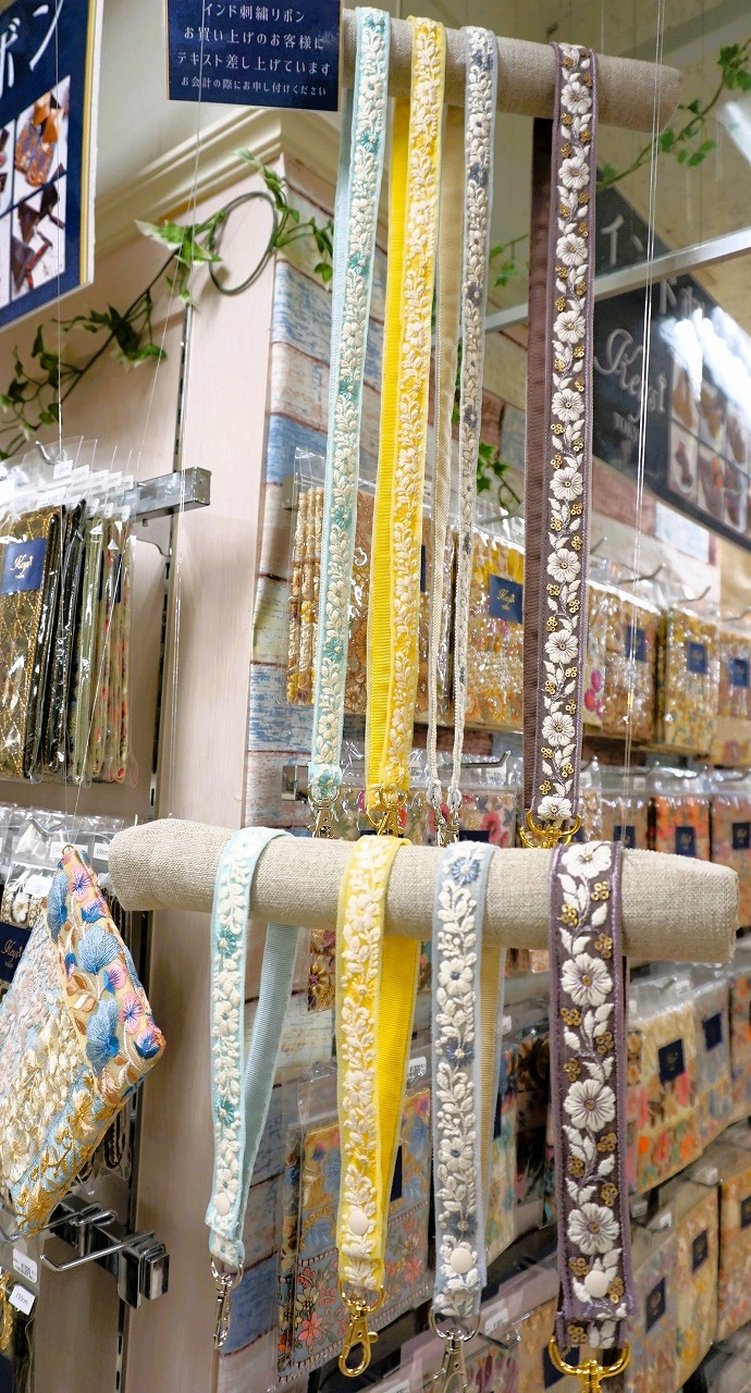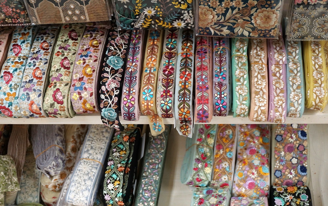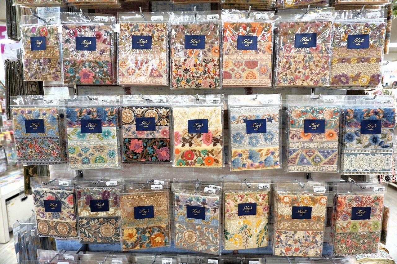 種類も増え、見本も増えたインド刺繍リボンコーナーは見るだけでも創作意欲が湧くこと間違いなし!見本は今回ご紹介したもの以外にも増えるかもしれません!?
