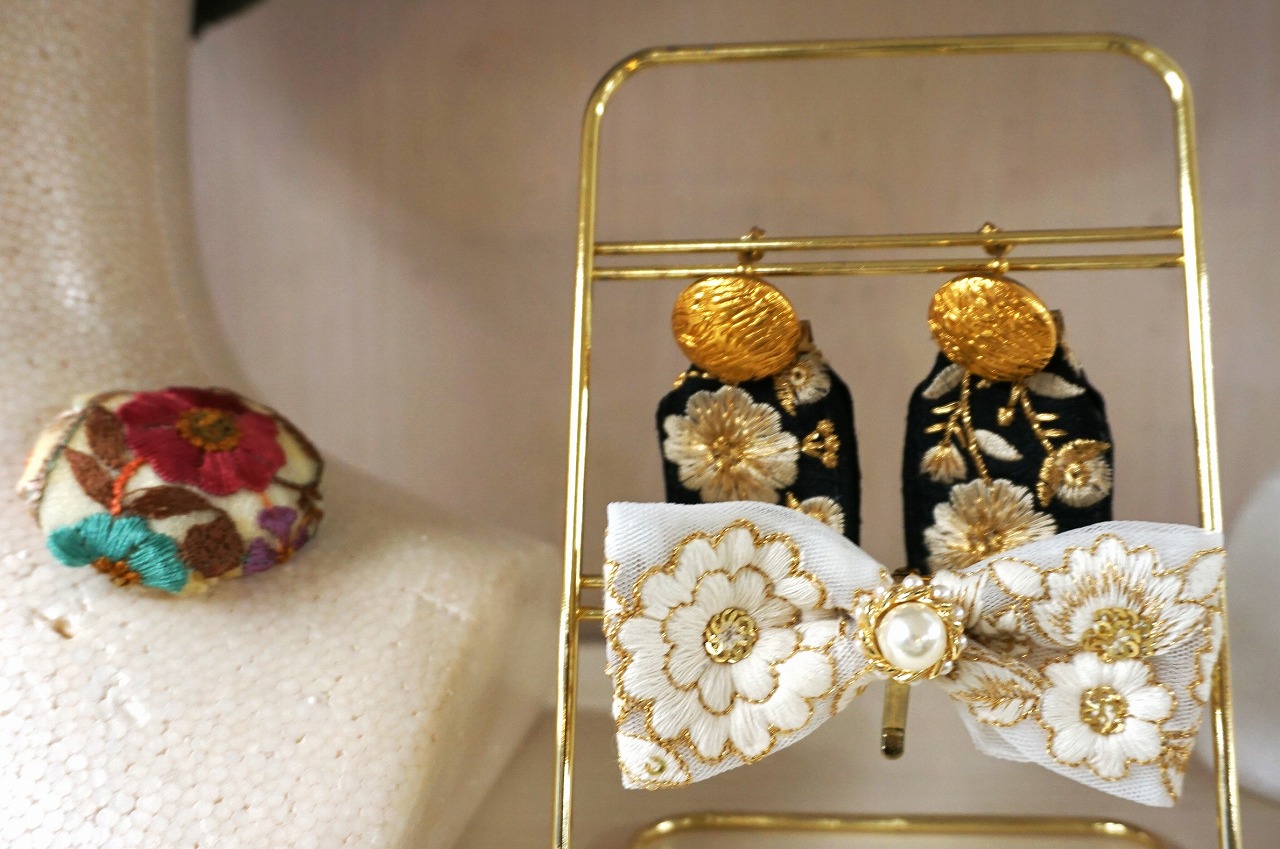 イヤリング、カチューシャ、ポーチ、バッグの装飾等にインド刺繍リボンを使用すると華やかです!