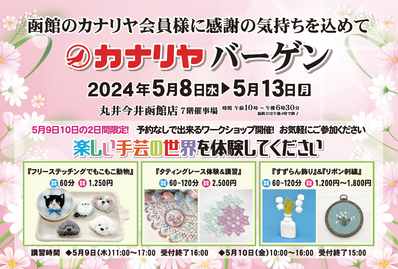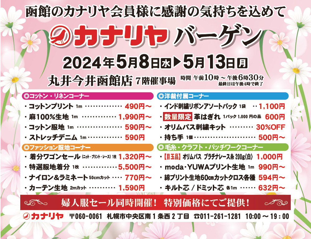 2024年5月8日(水)~13日(月)までの期間、函館のカナリヤ会員様に感謝の気持ちを込めて「カナリヤバーゲン」を開催致します。(終了致しました)