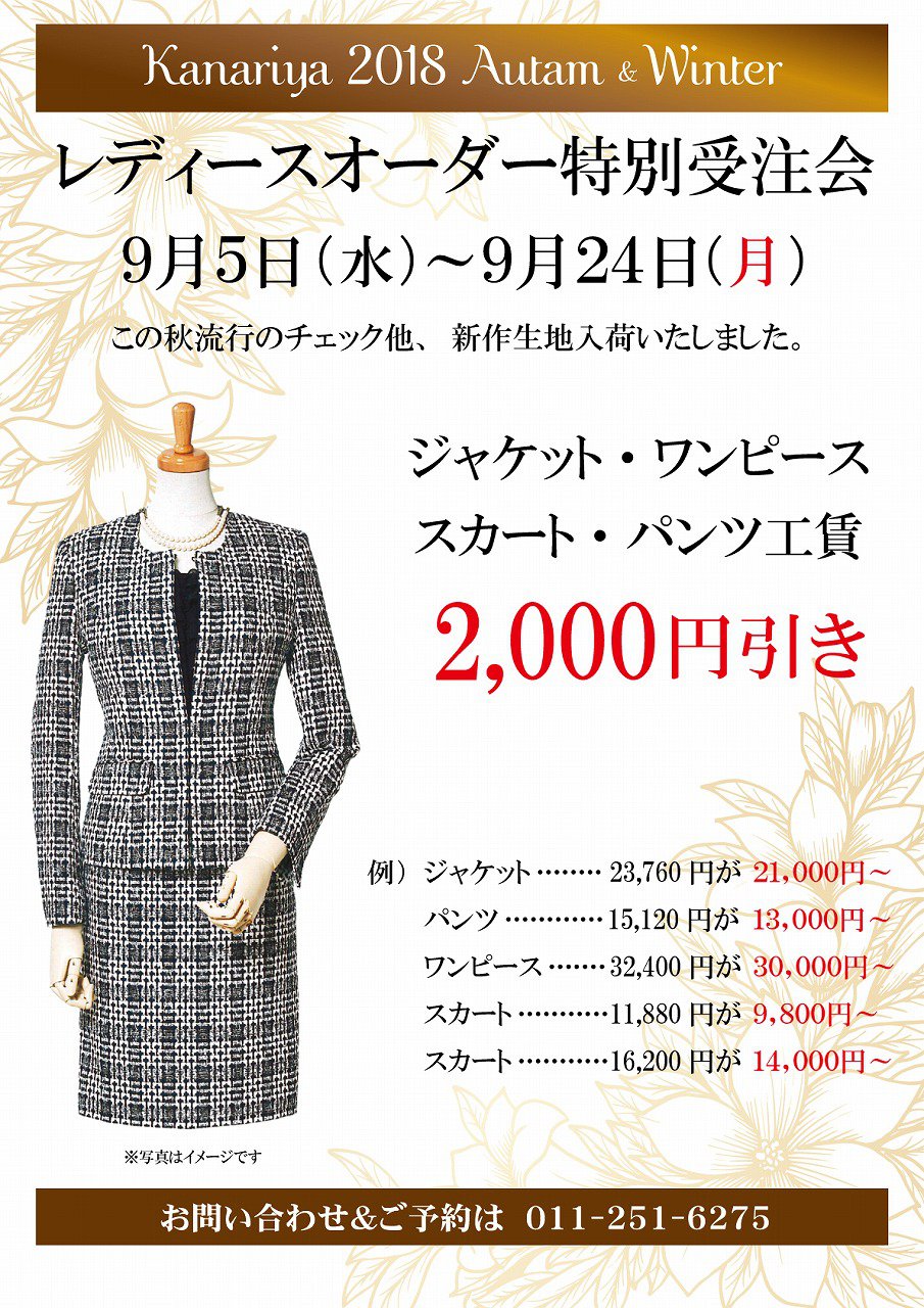 カナリヤ本店2階にて「レディースオーダー特別受注会」を開催致します。 ※現在終了