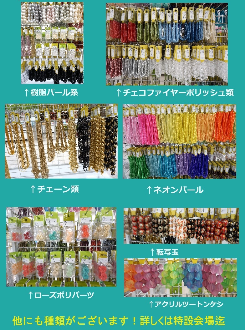 他にも樹脂パールやチェーン等、おすすめしたくなる素敵なビーズが会場にございます。見応えがあるのでカジュアルからオケージョン等に対応したものをお作り頂けます。