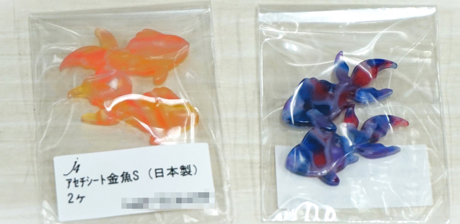 ・アセチシート金魚は、夏らしいモチーフとグラデーションになった色合いが素敵なパーツです。なかなか無いパーツなのでアクセサリー(かんざし、イヤリング、バッグチャーム等)を作ってみるのをおすすめします。