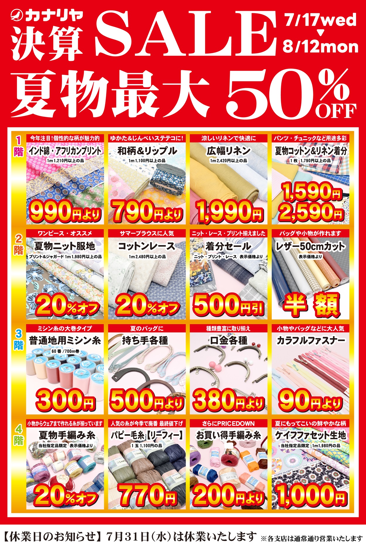 2024年7月17日(水)~8月12日(月・祝)迄の期間、カナリヤ本店にて「決算SALE」を開催致します。(終了致しました)