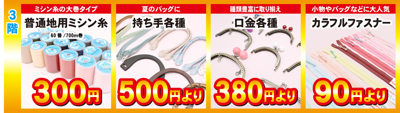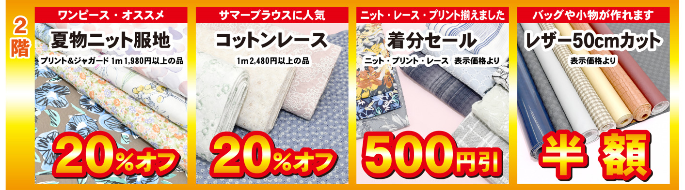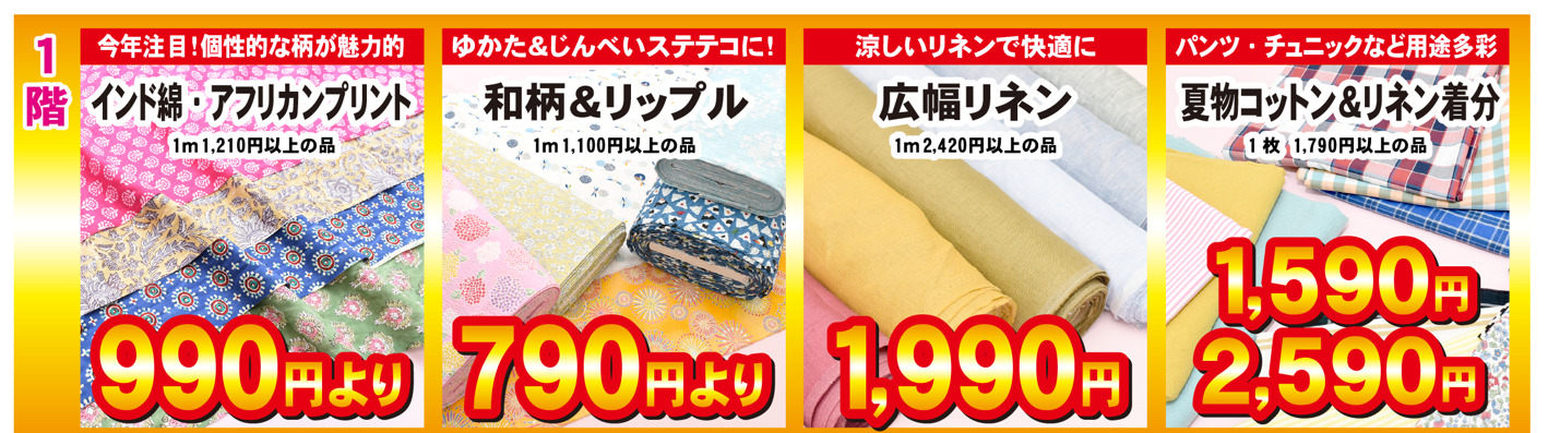 夏物として使いたくなる生地やアイテムがお買い得です。
