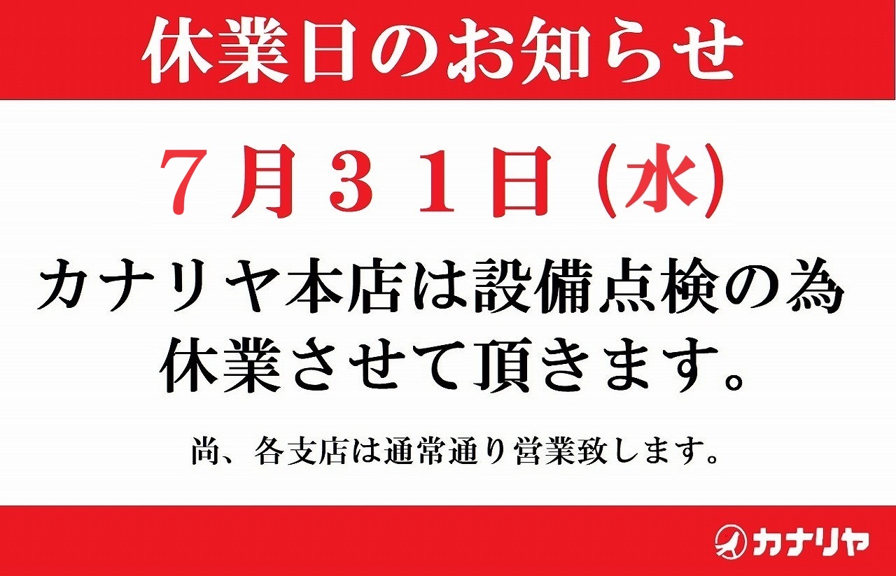 2024.07.20 トピックス カナリヤ本店 7/31(水)は休業日です ーカナリヤ本店からのお知らせですー 2024年7月31日(水)、 カナリヤ本店は設備点検の為、休業とさせて頂きます。 尚、各支店は通常通り営業致します。 お客様にはご迷惑をおかけ致しますが、何卒ご理解頂きます様、宜しくお願い申し上げます。 (株)カナリヤ 本店
