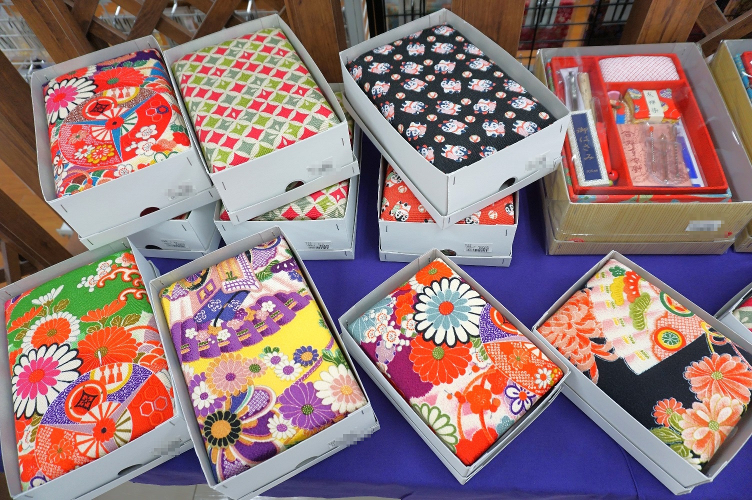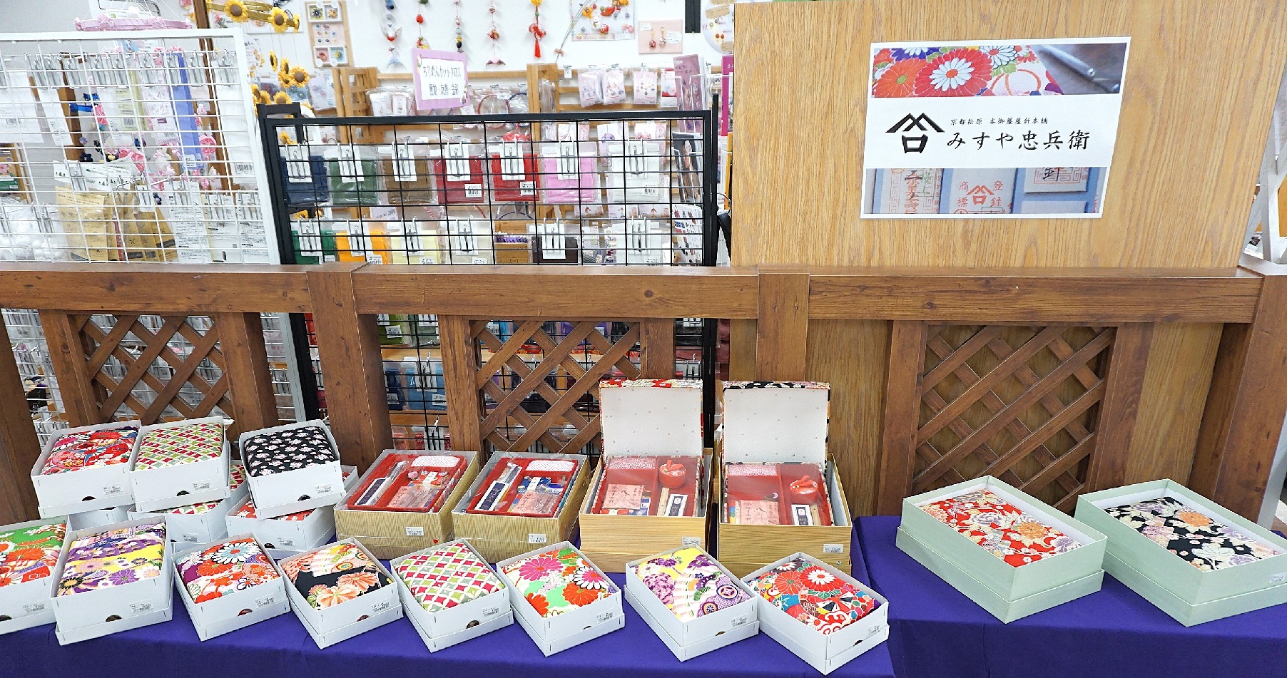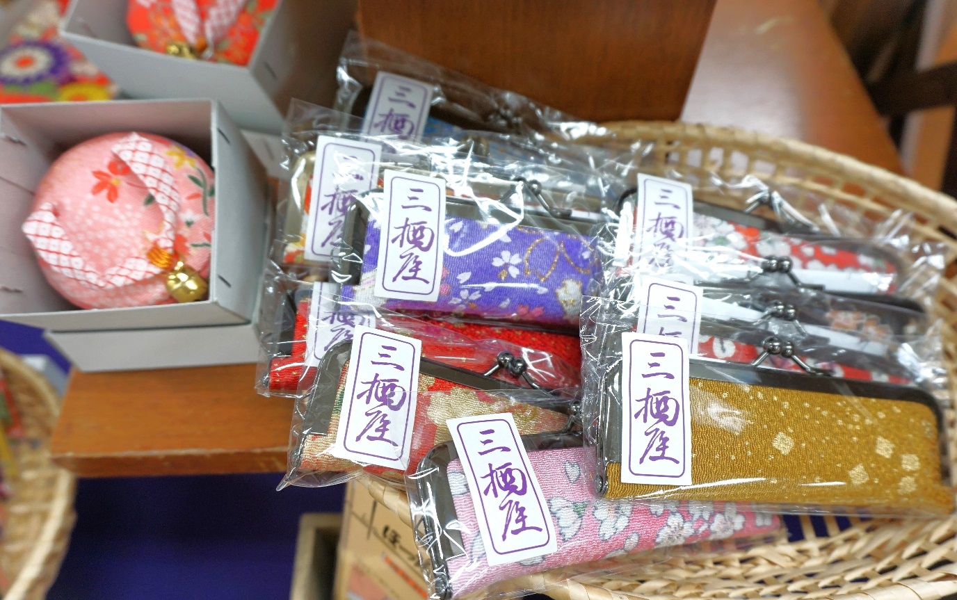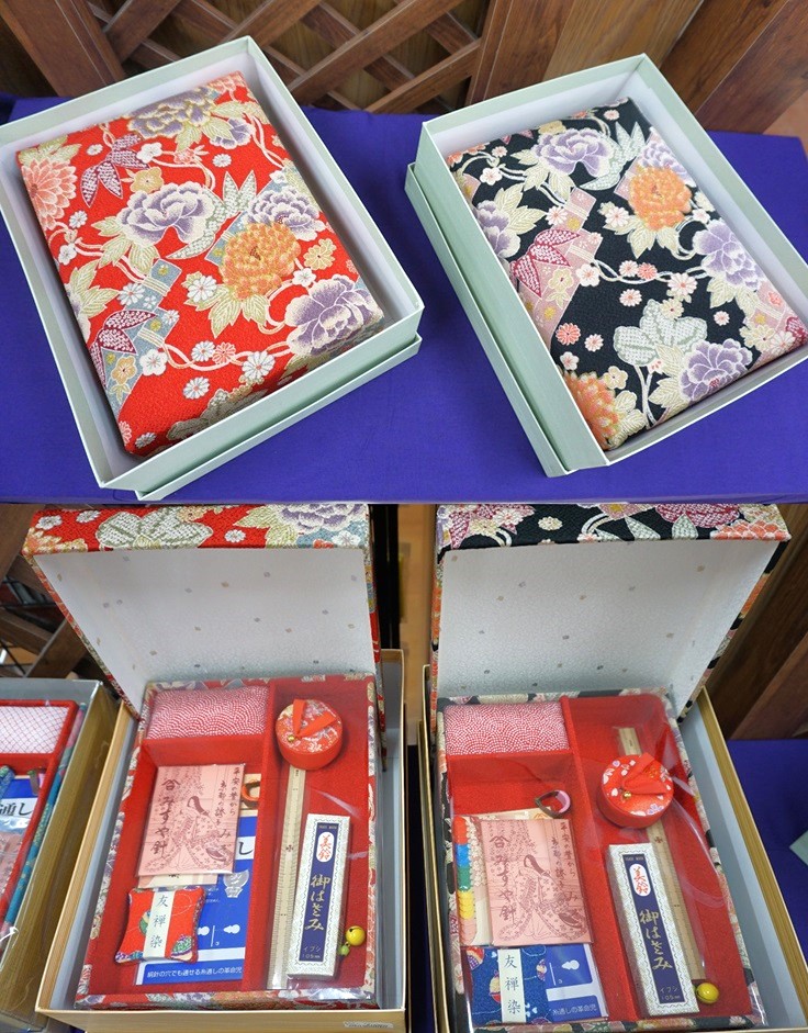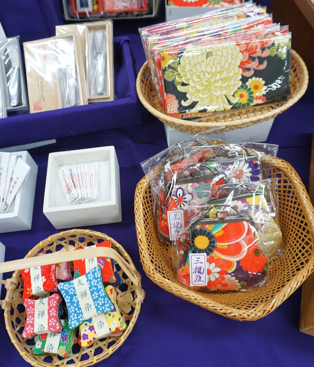 他にも京都ならではのちりめん生地を使用したお裁縫箱や印鑑ケース、和小物などを揃えております。