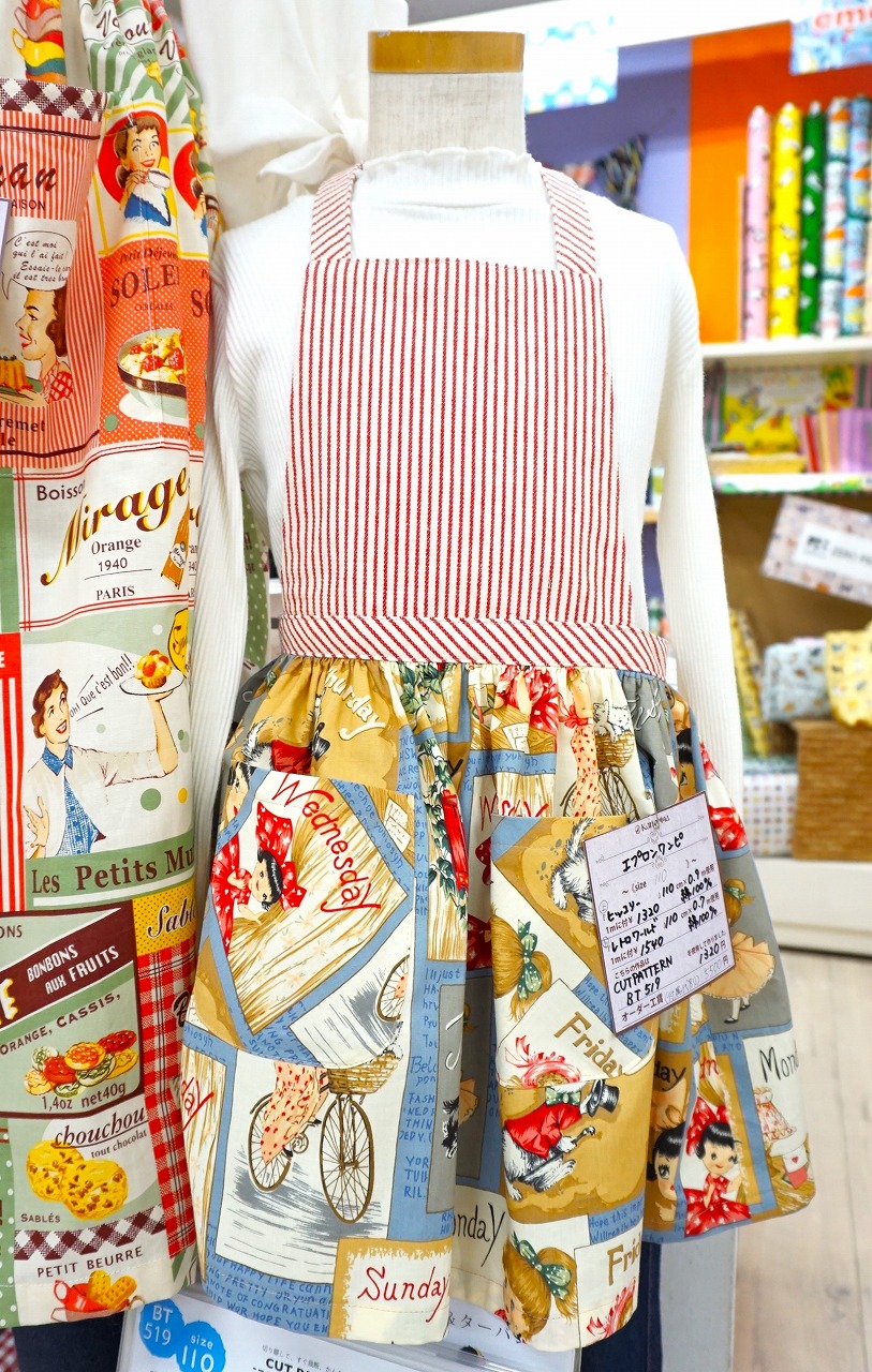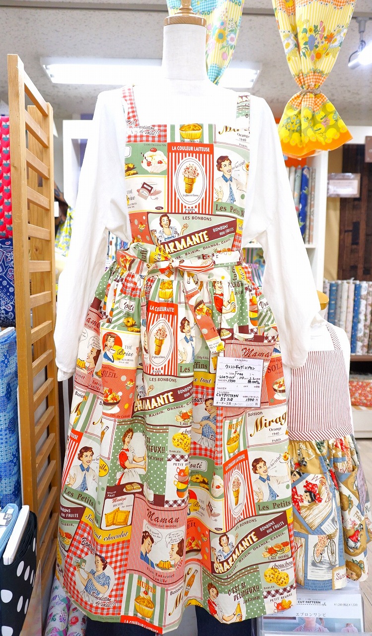 どちらも売場でパッと見つけて頂きやすい程、カラフルで元気になれそうな空気を出しています☆彡大人エプロンはウエスト部分がギャザーになっているので下に向けてふわっとしてワンピース見えする形です。レトロな雰囲気を出して頂ける大人可愛いエプロン見本です。
