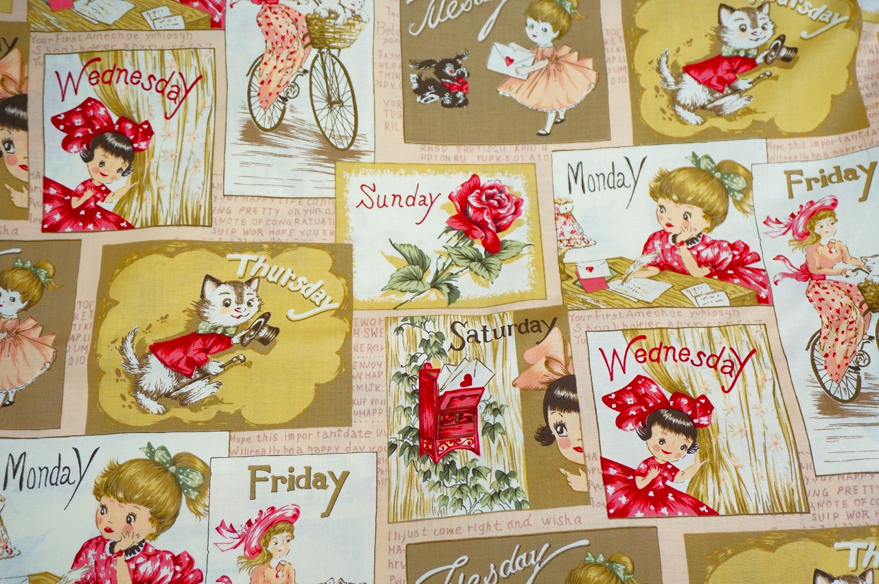 アメリカンレトロポップな生地が入荷しました!!60年代風のシーチング生地で、エプロンやワンピース、シャツなどお洋服の他、バッグなど小物にもピッタリです。