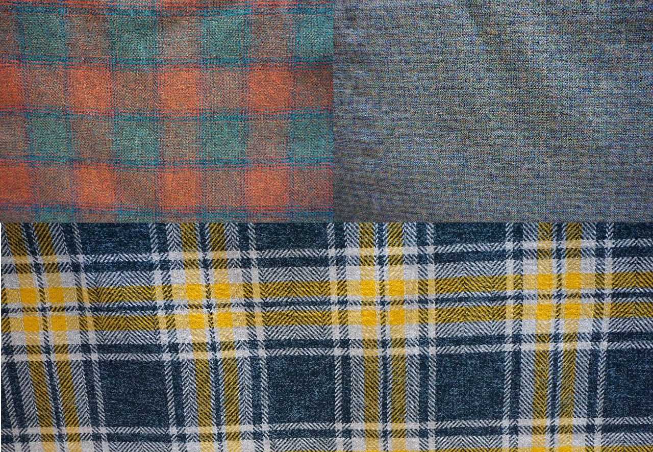 程良く厚みもあり、ウールやツイードよりも気軽に使うことができる素材感でチクチクとしにくく、コットンならではの優しい肌触りを感じながら秋のおしゃれを楽しめる人気生地です。秋らしいチェック柄や色々な色が混ざった無地系共に合わせやすいものばかりです♪