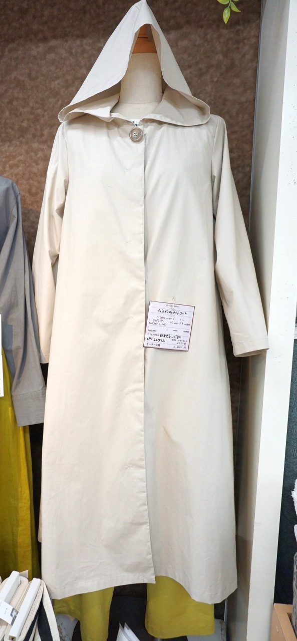 タイプライター生地を使用した、Aライン型のフード付きライトコートになります。程よく長めでAラインの形がスタイルを良く見せてくれる人気の見本です。