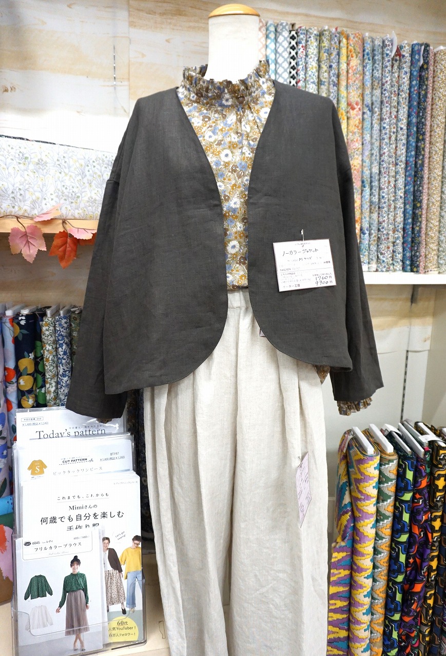 見本では、フード付きのライトコートを展示しております。最近のハンドメイド本でも使用されていることが多いので、この秋スタッフ間でも注目されている生地だったりします!