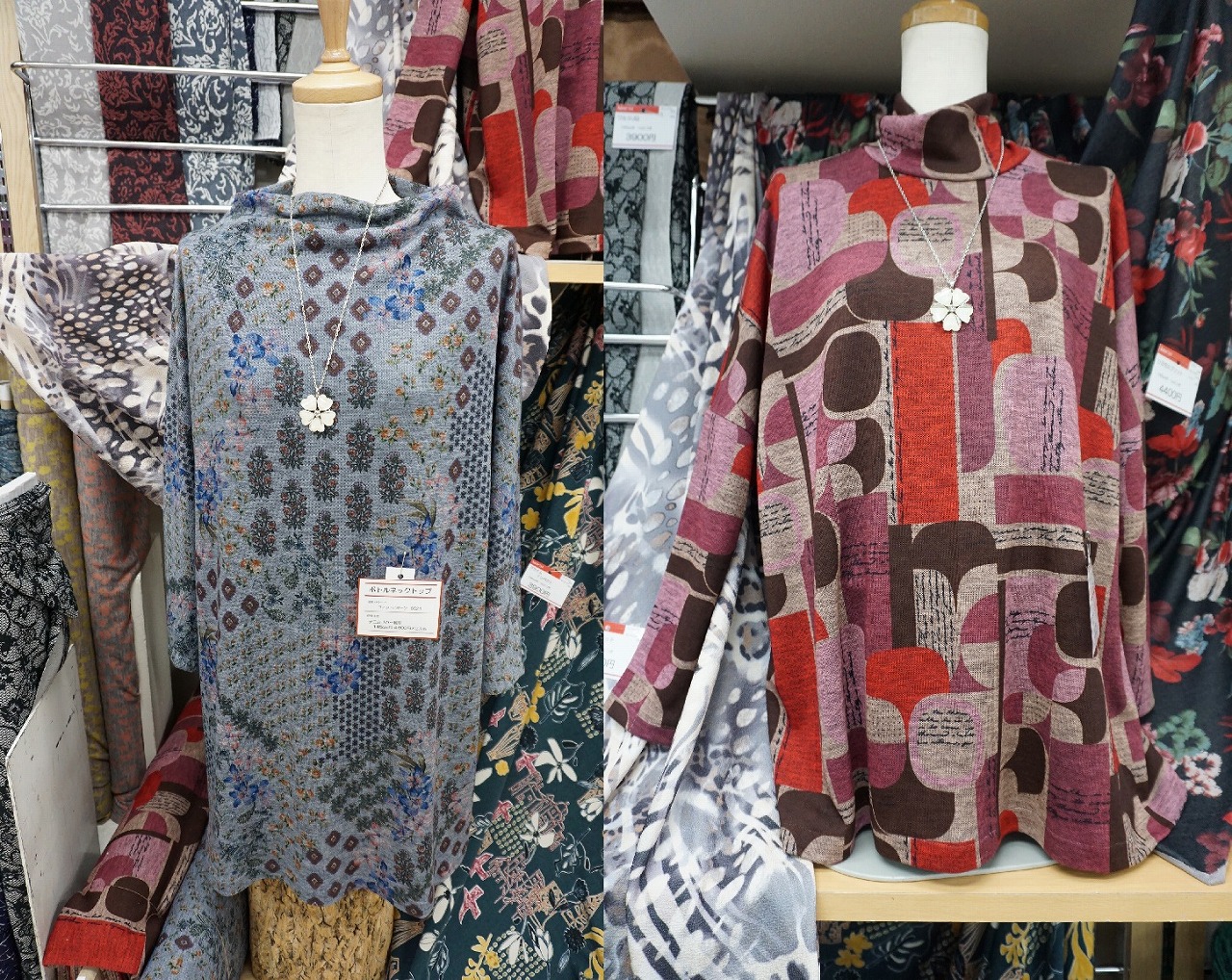デニムリバー転写プリントを使用したトップス2種も展示中!ニット素材なので見本のようにボトルネックやハイネックタイプのトップスを作ってみるのがおススメです。どちらも柄物で存在感があるので、ボトムスは無地のスカートやパンツを合わせて頂くとオシャレに決まります。