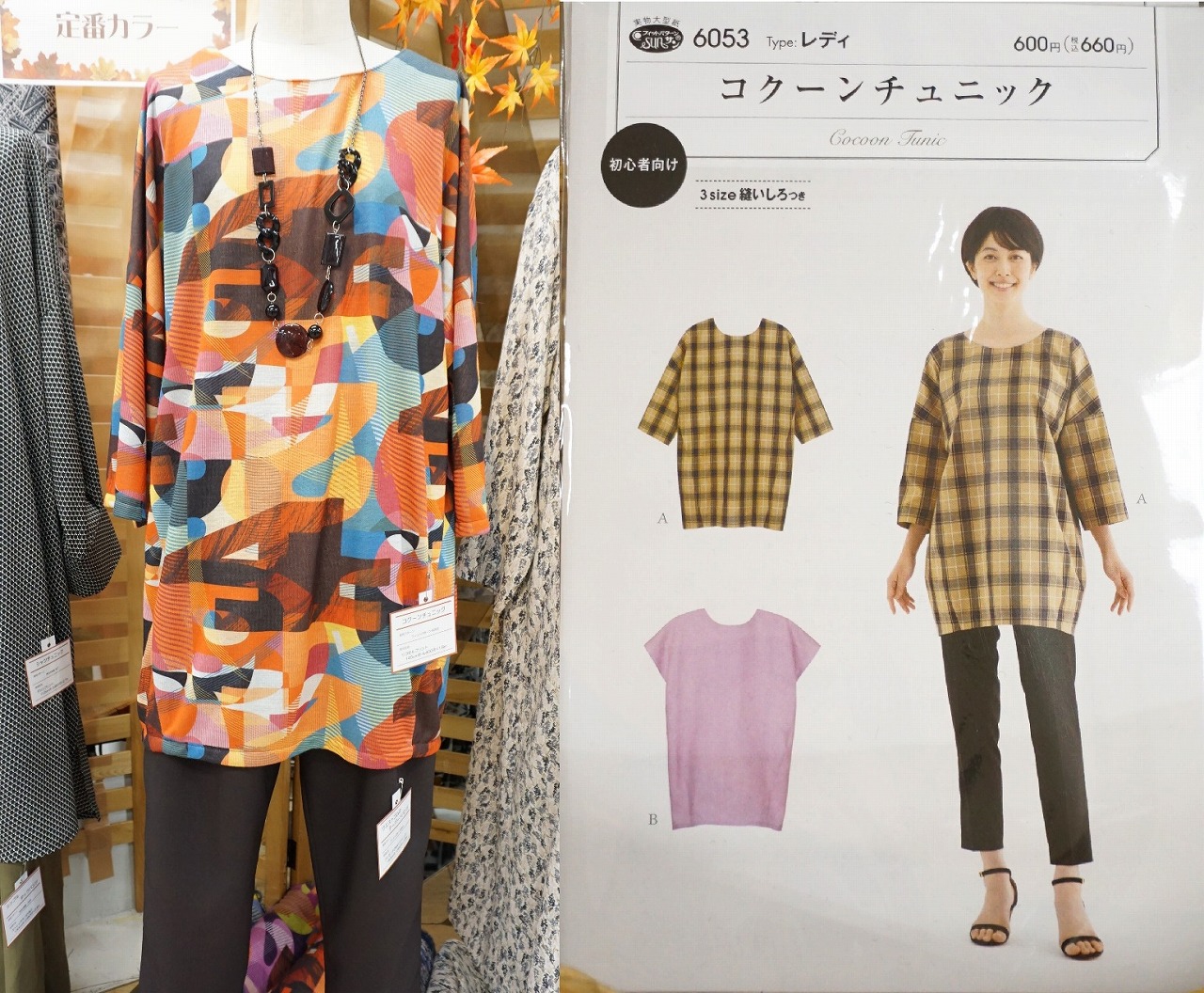 リヨセル生地を使用したコクーンチュニックの見本と使用型紙になります。コクーン型で広がらずフィットした仕上がりなのでスッキリと着用できそうですね。パンツやスカート共に合わせやすいコクーンチュニックは1枚あるとあらゆるシーンに着て頂けます。