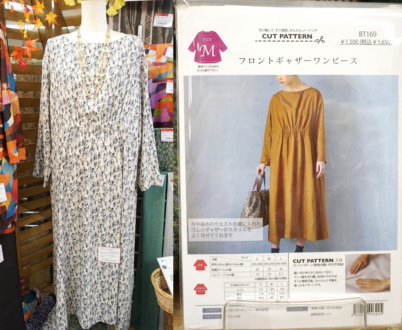デシンプリントの花柄生地を使用したワンピース見本と使用型紙になります。