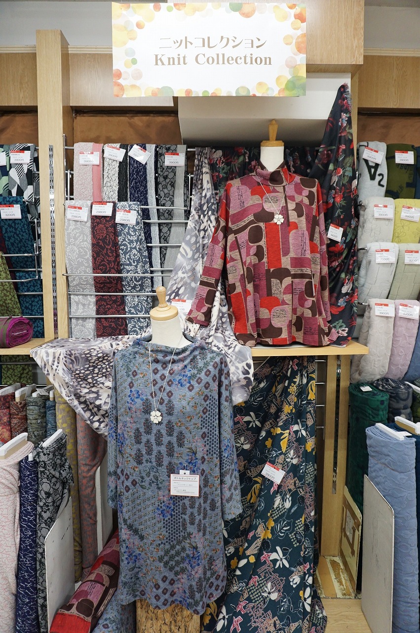 オータムコレクションにも登場した秋服向けのコーナーになります。こちらの写真に表示してあります生地が秋服作りにぴったりです♪また、すぐ近くにデニムリバー転写ニットを使った見本と関連生地もございます。