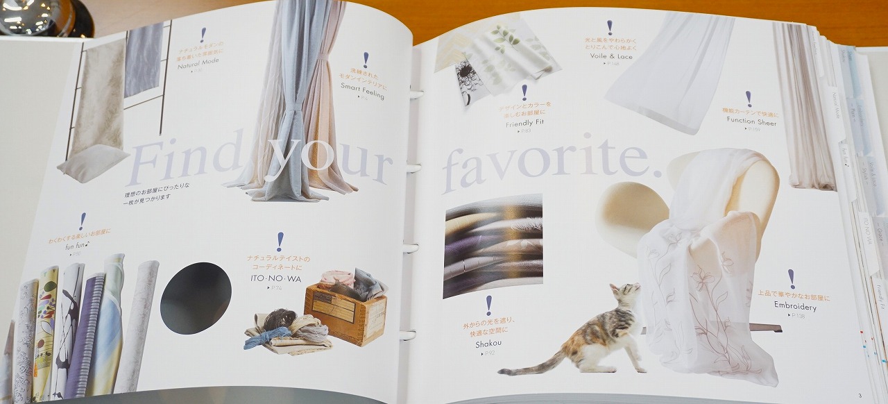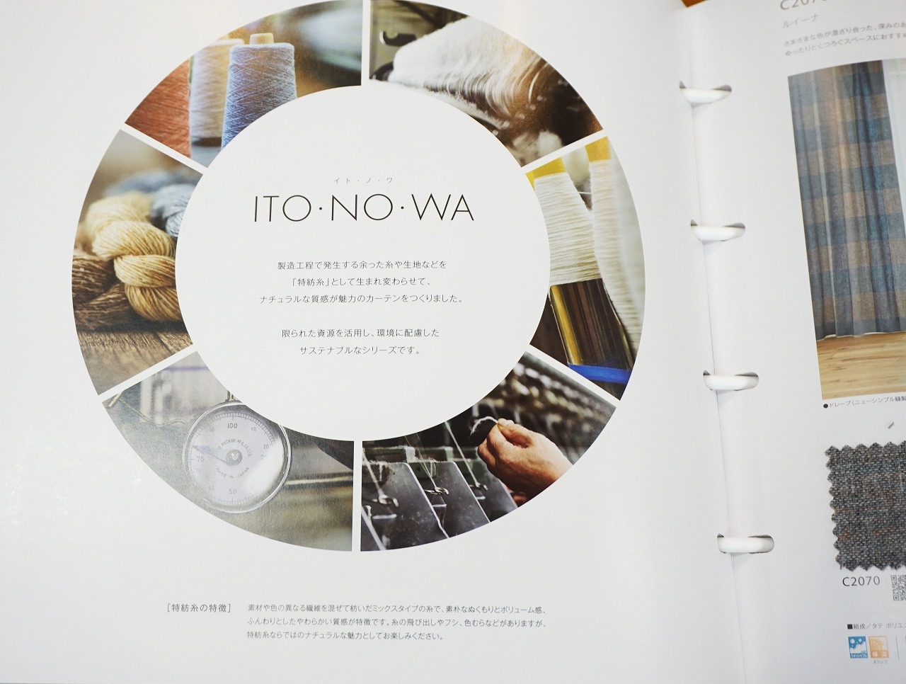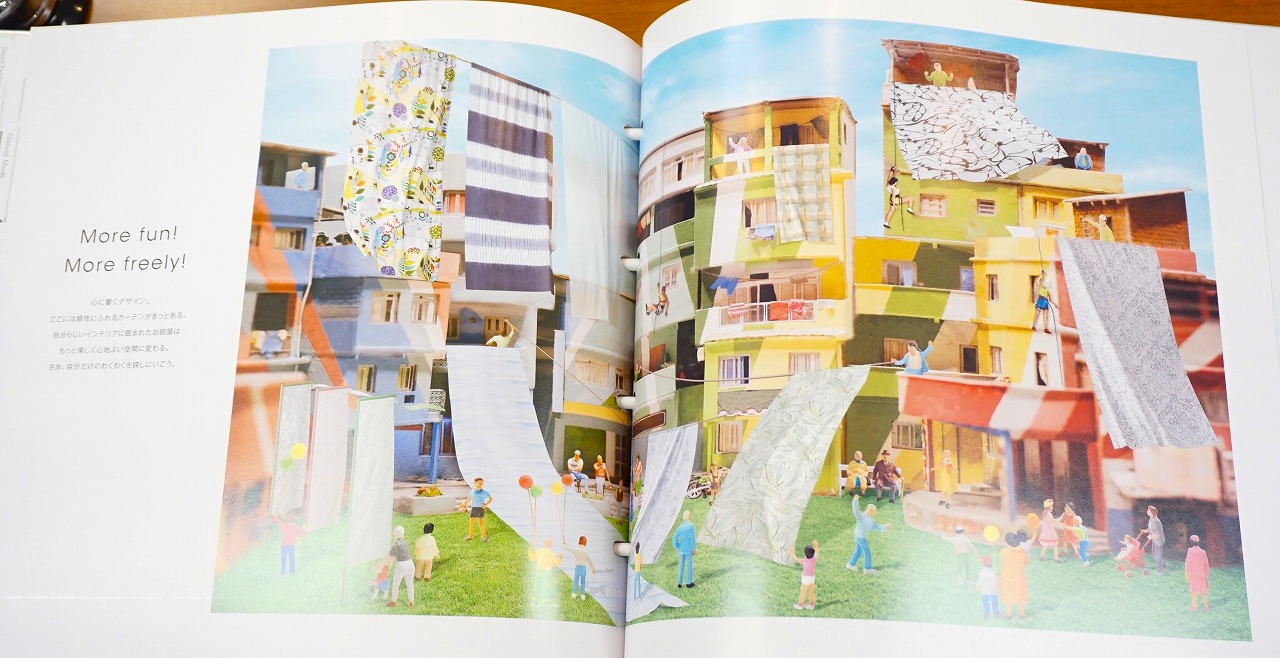 定番の遮光・防炎カーテン以外でも、夏にも冬にも活かせる省エネカーテンや動物のひっかきに強いカーテン・生地の製造工程で出た余った糸・生地を「特紡糸」として生まれ変わらせて作るサスティナブルなカーテン・ありそうでなかった綿素材のドレープ・レース生地のシリーズなど工夫を凝らした1冊になっています。