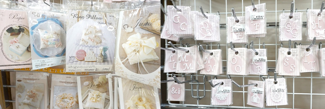 ウェディングピローが作れる種類豊富なキット類、白をベースとした刺しゅうワッペンになります。大人っぽさと可愛らしさのあるアイテムをご自分で作られる方が多いです。