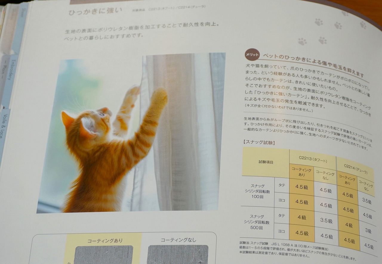 ひっかくと毛玉ができやすかったり、ひきつれ(スナッグ)を起こしてしまいますが、耐久性のあるカーテンと言われる程、通常のカーテンより限りなく丈夫で毛玉など減らすことが期待できます。