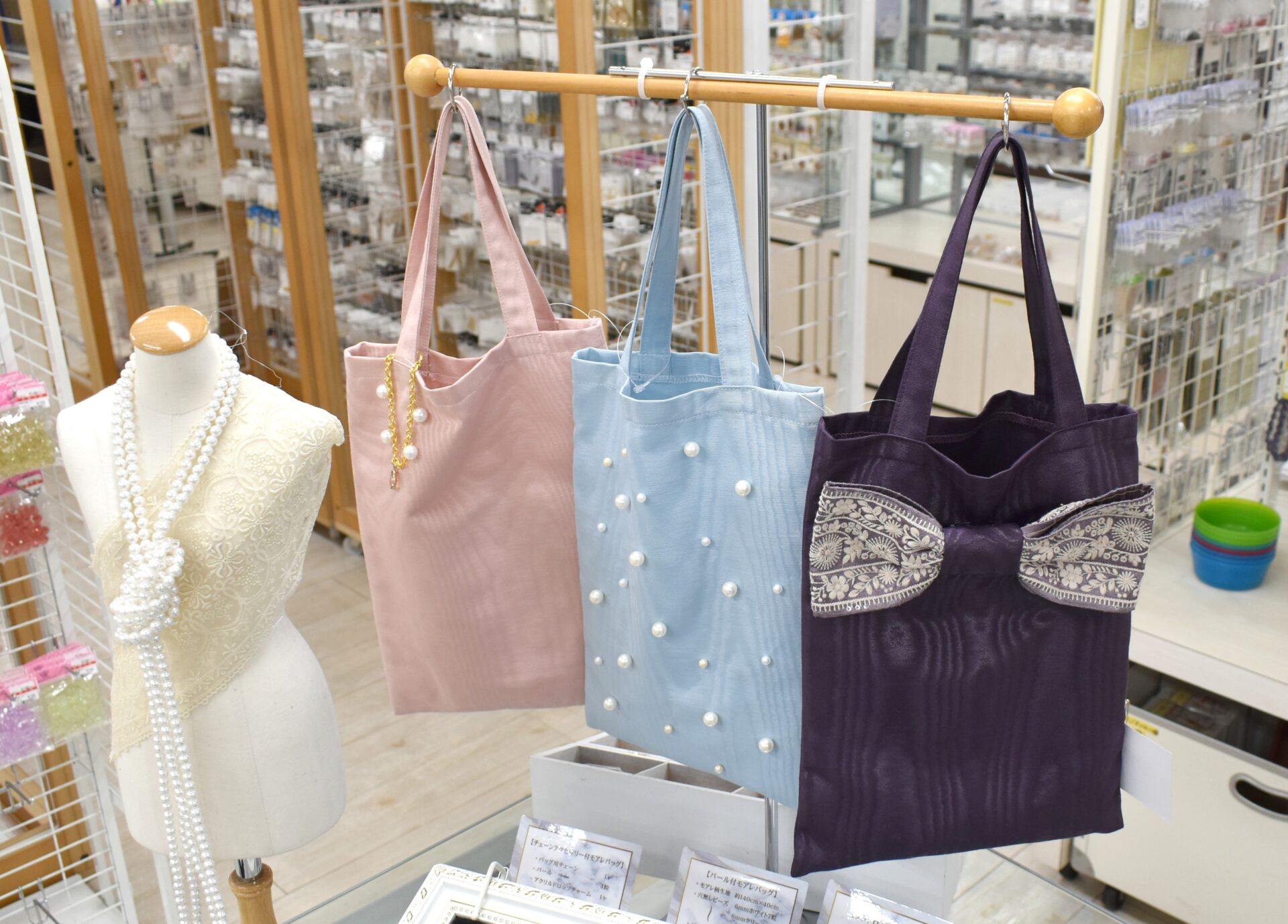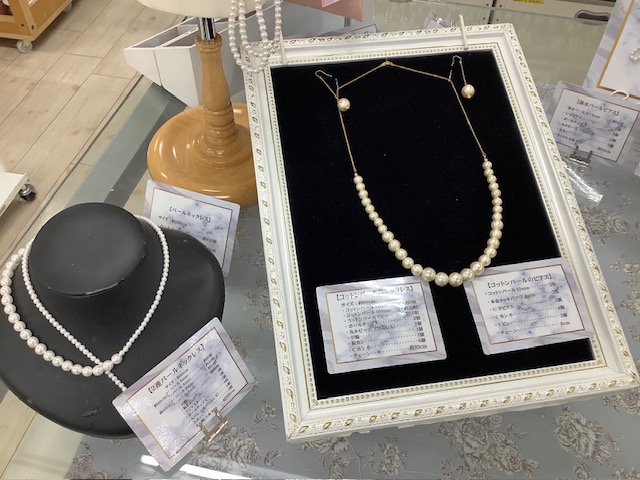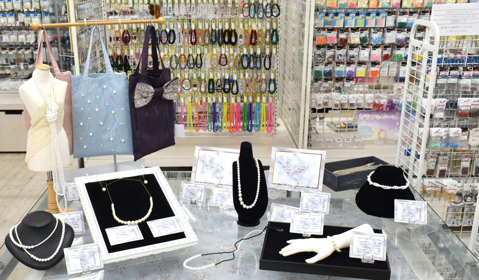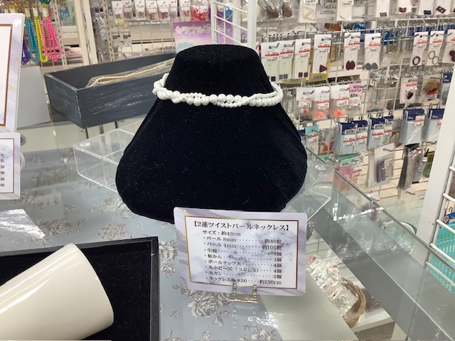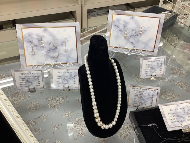 パーティ用のネックレスやピアスを手づくりできるパールや金具を取り揃えています。