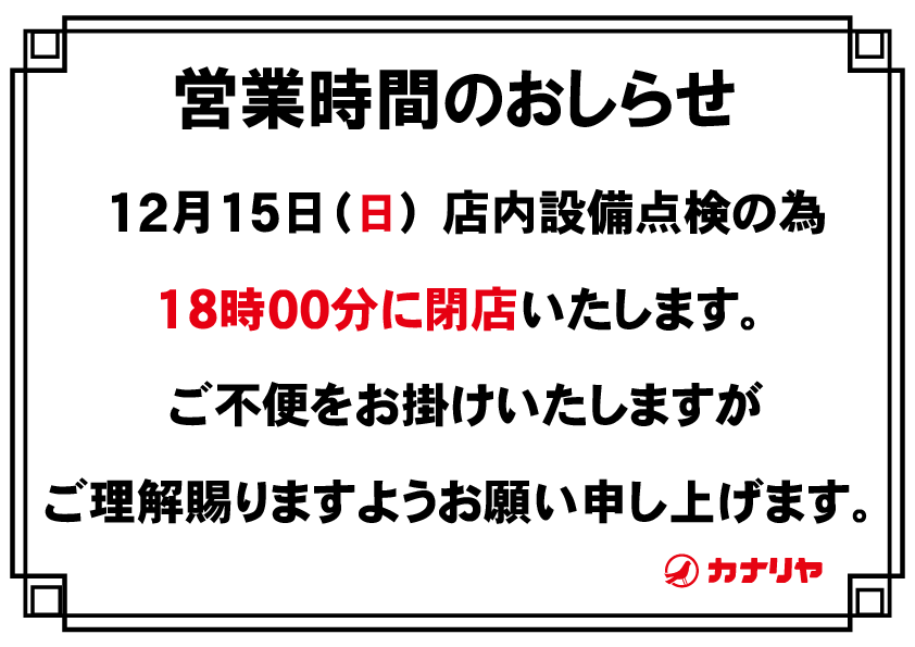 〈本店〉12/15㈰ 短縮営業のお知らせ