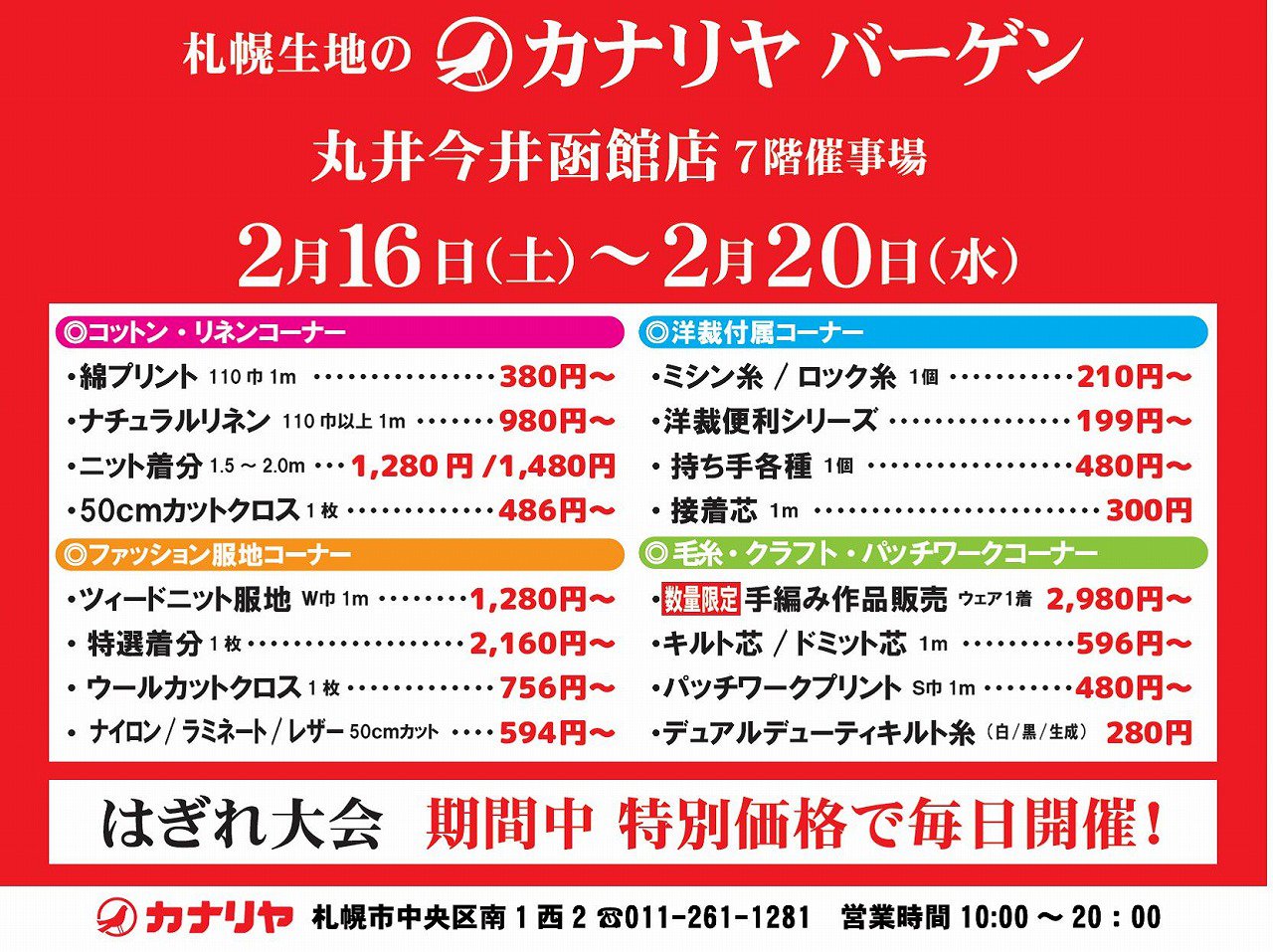 (終了)函館催事:札幌生地の「カナリヤバーゲン」のお知らせ