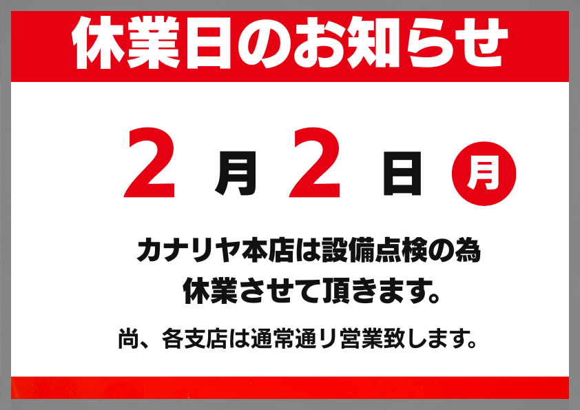 2026.01.11 イベント・催事 ⭐〈本店〉2/2㈪は休業日です。 -カナリヤ本店からお知らせです- 2026年2月2日(月) カナリヤ本店は設備点検の為、休業させて頂きます。 尚、各支店は通常通り営業いたします。 お客様にはご迷惑をおかけいたしますが、ご理解いただきます様、よろしくお願い申し上げます。 (株)カナリヤ 本店