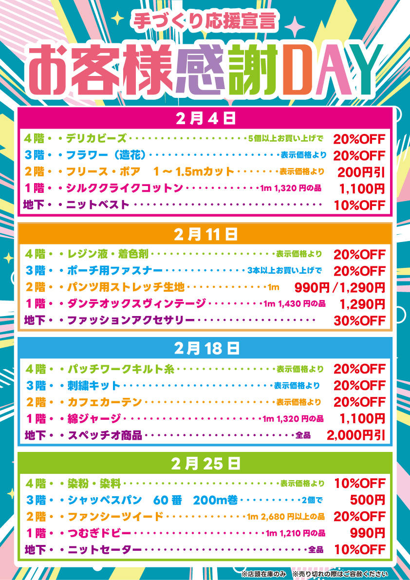 2026.01.28 イベント・催事 ⭐2026年2月の毎週水曜日 お客様感謝DAY 2026年2月の毎週水曜日 お客様感謝DAY 「毎週水曜日お客様感謝day」 2026年2月分ポスターをアップしました! 本店1階・2階・3階・4階と地下のタイムファンから、毎週水曜日のお買い得商品をお知らせいたします。 ぜひこの機会にご来店ください✨ ※店頭在庫のみ ※売り切れの際にはご容赦ください。
