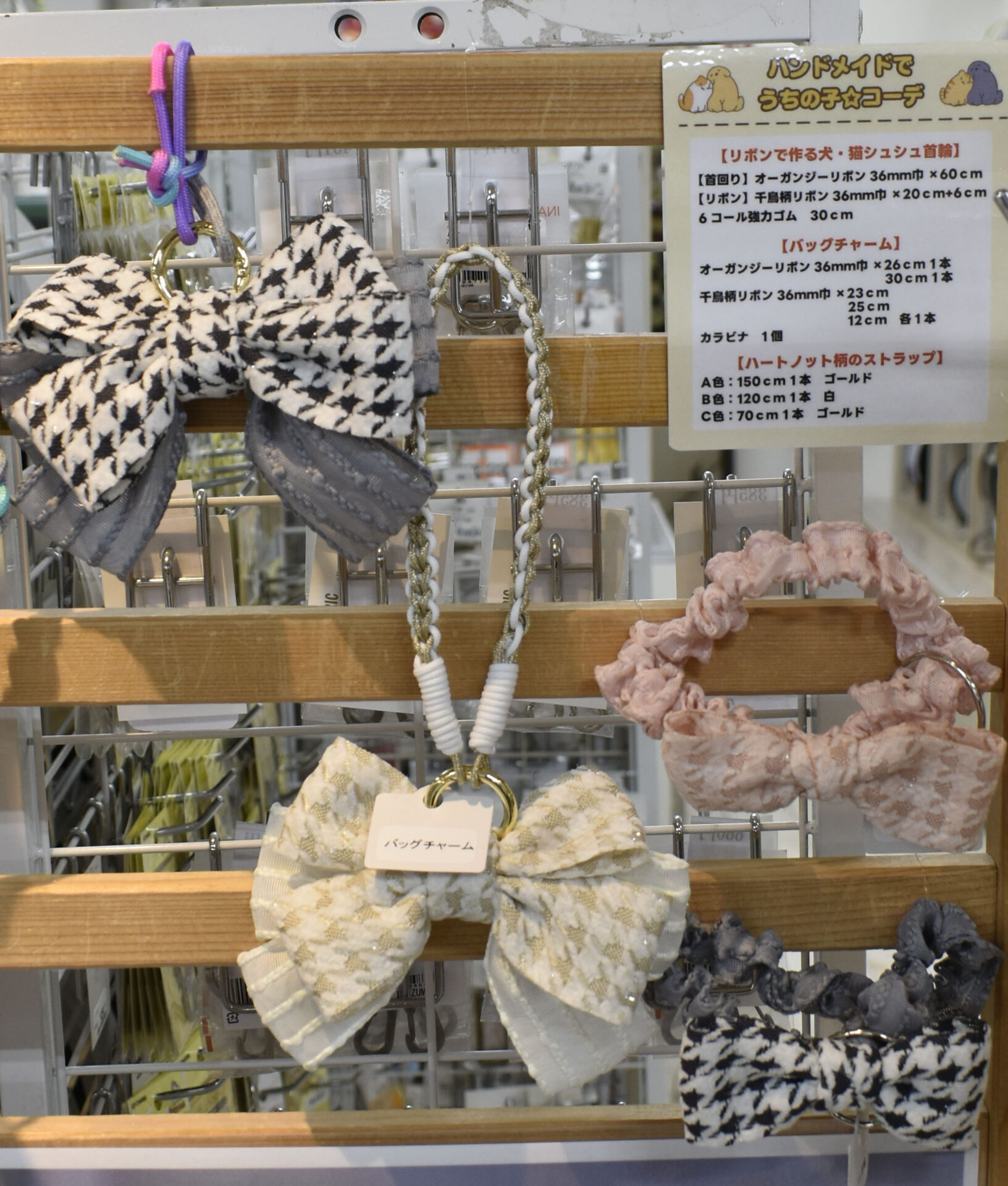 その他に、リボンがポイントのネコちゃん用シュシュ首輪や飼い主さん用におそろいのバッグチャーム。