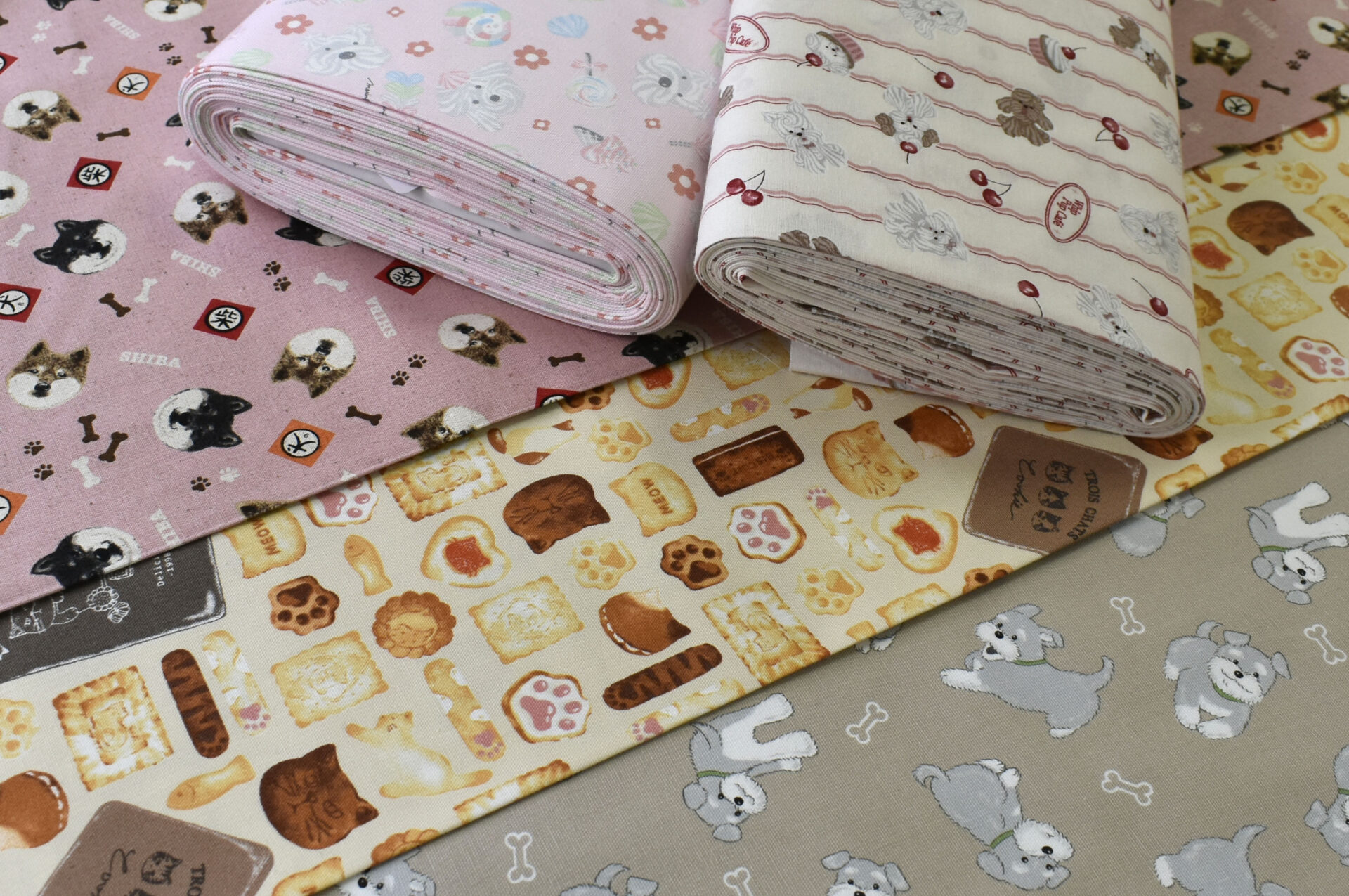 綿生地や綿麻生地でわんにゃん柄の可愛い生地が種類豊富にお取り扱いしております。