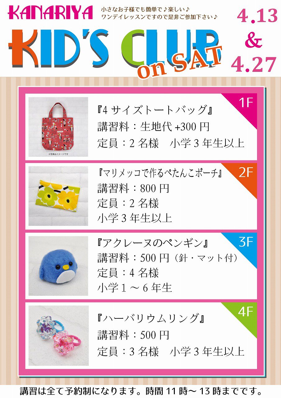 カナリヤ本店では「キッズクラブ」4月分(4/13・27 土曜日開催)が更新されたのでお知らせ致します。 ※終了致しました。
