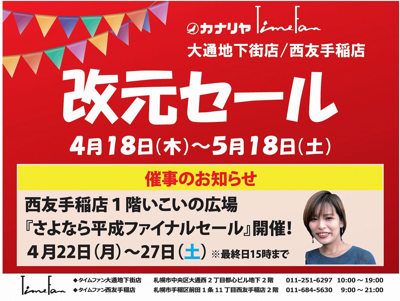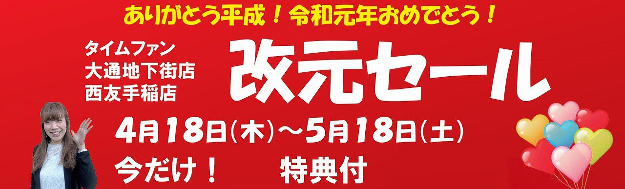 2019年4月18日(木)~5月18日(土)までの1カ月間、タイムファン大通地下街店と西友手稲店の2店舗にて、”ありがとう平成!令和元年おめでとう!”という事で