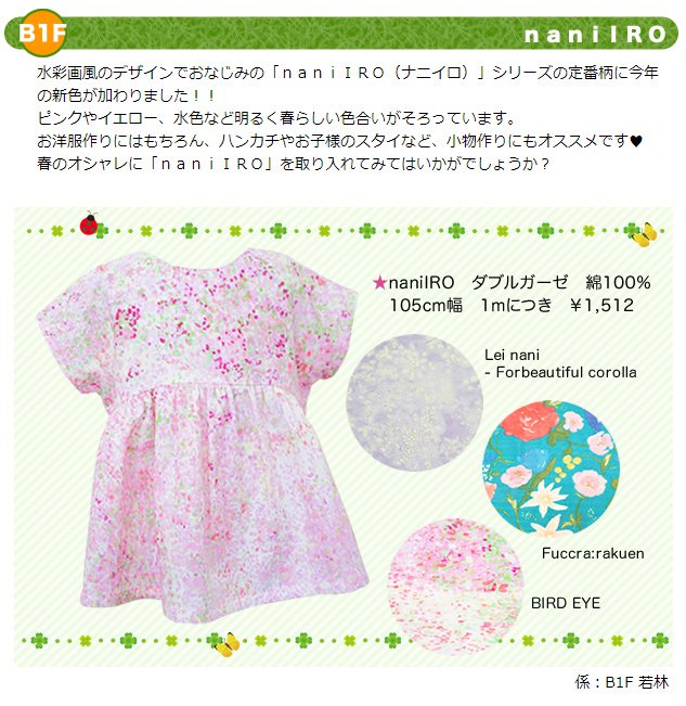定番の柄に新色が登場した、水彩画風のデザインがきれいな「naniIRO(ナニイロ)」、ウエストがゴムでボリューム感のある上品でコーデに1枚つくって履きたくなる「サーキュラースカート」、リネンライクの生地で大きな花柄が目を惹く春夏向けのワンピース「ノーマルAラインワンピース」、手芸や読書、スマホチェックの時等に使いたい、ブルーライト20%カットと拡大率1.6%が嬉しいメガネ型のルーペ「コンパクトルーペ」、そのまま飾っても、ハーバリウムやサシェ等に使いたくなるワンポイント使いにおすすめの「あじさいキューブ」を紹介致しております。