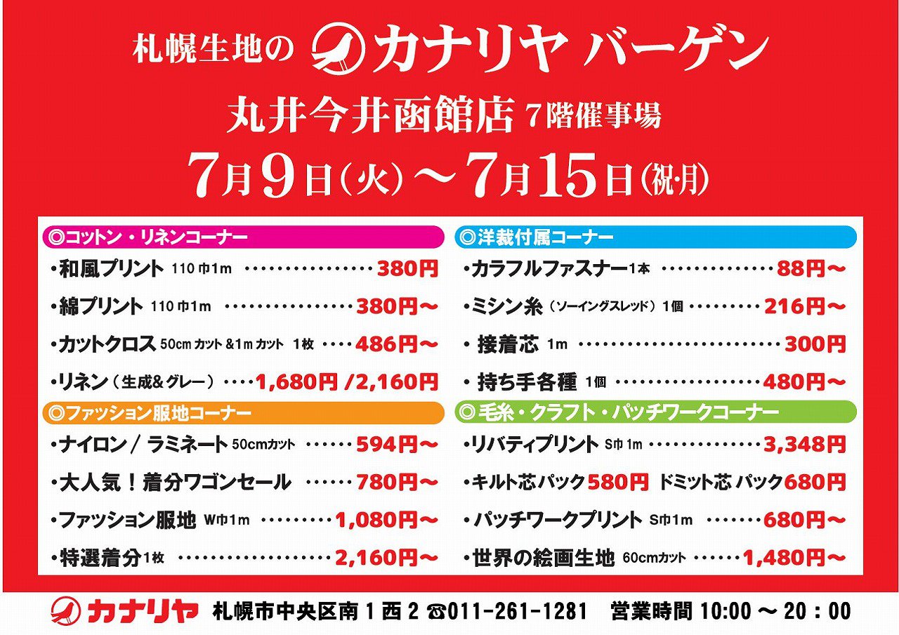 (終了)函館催事:札幌生地の「カナリヤバーゲン」のお知らせです
