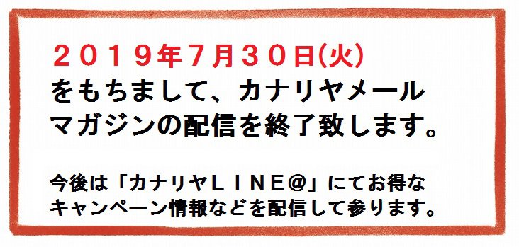 この度は誠に勝手ではございますが、2019年(令和元年)7月30日(火)をもちまして、カナリヤメールマガジンの配信を終了させて頂くことになりました。