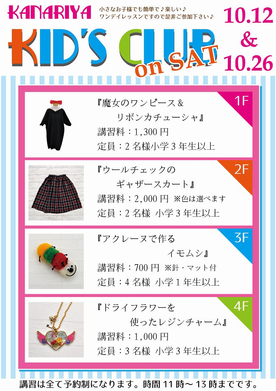 カナリヤ本店では「キッズクラブ10月分(10/12・26 土曜日開催)が更新されたのでお知らせ致します。