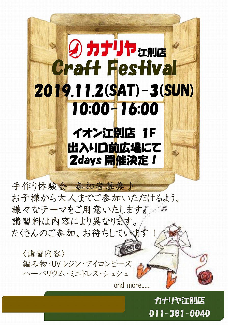 2019年11月2日(土)・3日(日)の2日間、カナリヤ江別店にて「Craft Festival-クラフトフェスティバルー」を開催致します。