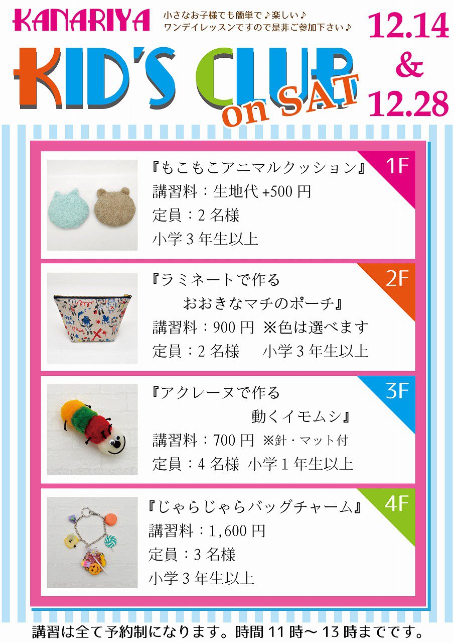 カナリヤ本店では「キッズクラブ12月分(12/14・28 土曜日開催)が更新されたのでお知らせ致します。