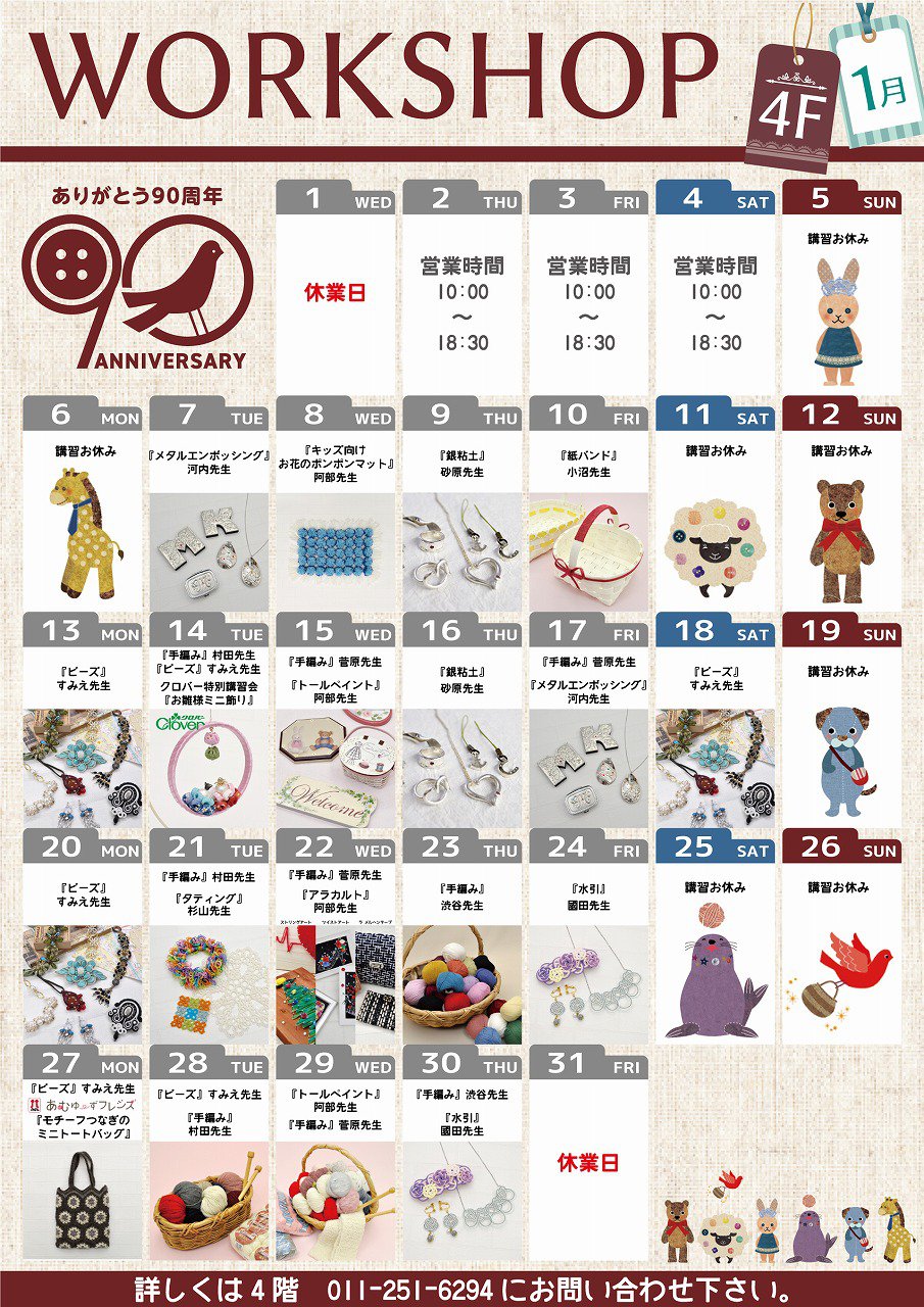 4階ではビーズ、毛糸、クラフト等の他に、あむゆーず毛糸講習、トールペイント、ストリングアート・ラメルヘンテープ・ツイストアートの中から選べる「アラカルト講習」、タティングレース等に加え、冬休み向けのキッズ講習やクロバー特別講習等もございます。
