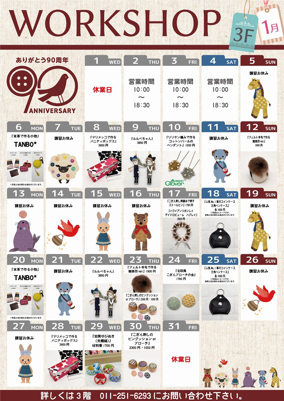 3階ではレザー講習・クロバー講習、リボンレイ、ブサかわペンギン雛(換羽バージョン)、ルルベちゃん、こぎん刺し等を作っていきます。また、クロバー主催のワークショップを開催致します!