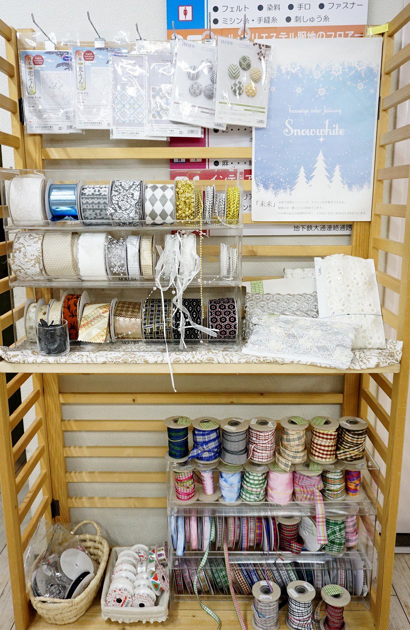 生地はレースやコットン、チュール、ボア等の軽さを感じさせるものから暖かい生地などが豊富で、アイテムは毛糸、リボン等が揃っています。