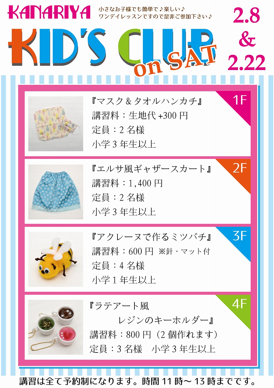 カナリヤ本店では「キッズクラブ」2月分(2/8・22 土曜日開催)が更新されたのでお知らせ致します。