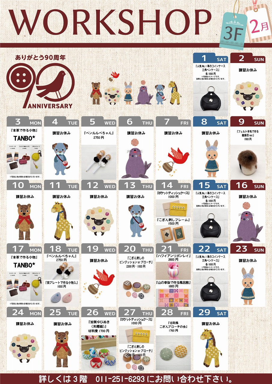 3階ではレザー講習、クロバー講習、リボンレイ、ブサかわペンギン雛(換羽バージョン)、ペンルルベちゃん、こぎん刺し等を作っていきます。また、クロバー主催のワークショップを開催致します!