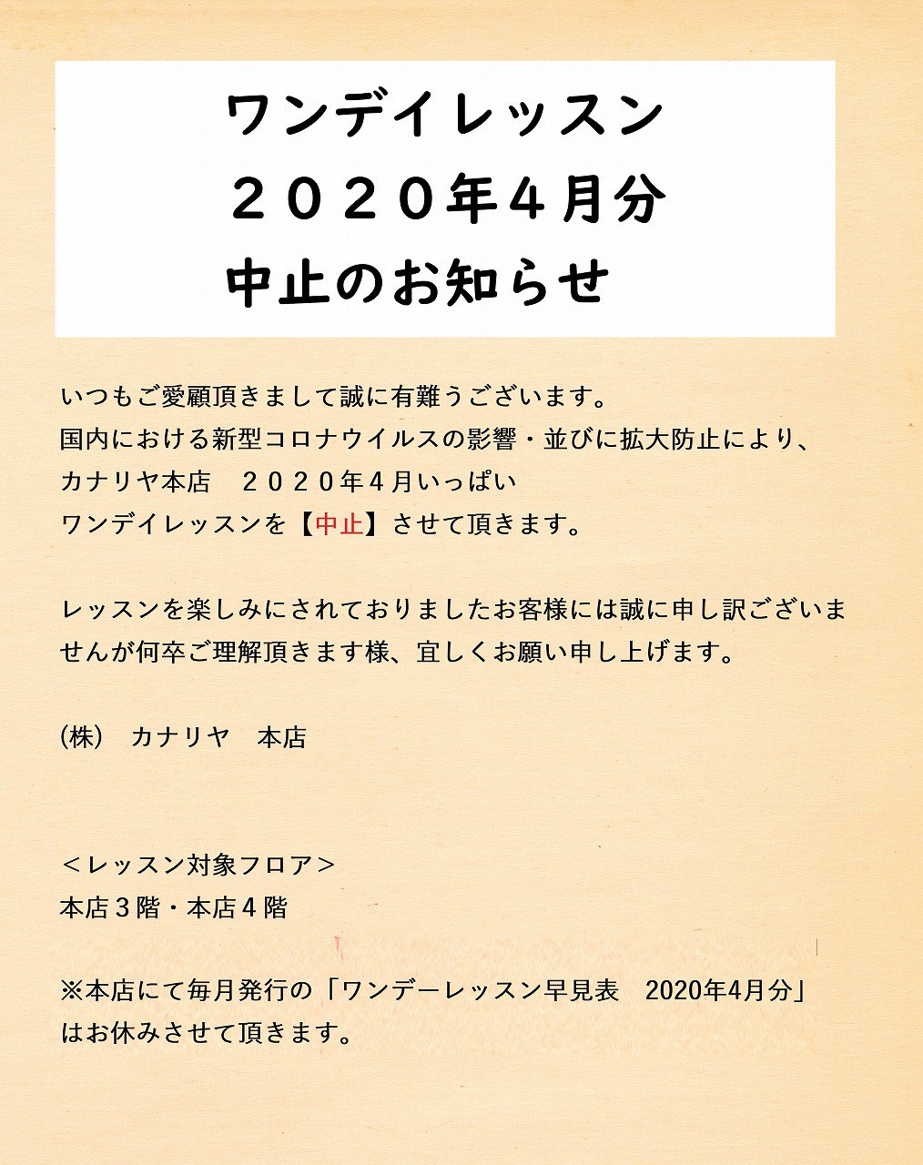 【重要】本店ワンデイレッスン 2020年4月分 中止のお知らせ