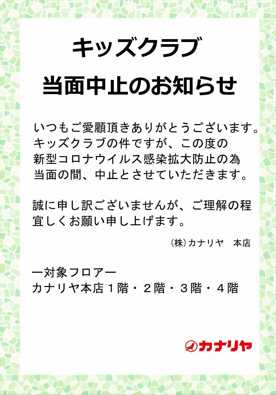 2020.04.30 トピックス 【お知らせ】キッズクラブ 当面中止のお知らせ ーカナリヤ本店よりキッズクラブ 当面中止のお知らせー いつもご愛顧いただき有難うございます。 新型コロナウィルスの拡大防止の為、カナリヤ本店「キッズクラブ」5月分以降の講習は 当面の間、中止とさせていただきます。 ーキッズクラブ対象フロアー 本店1階・2階・3階・4階 前々から準備して参りましたが、誠に申し訳ございませんがご理解の程よろしくお願い申し上げます。 再開の時期につきましては状況を見ながらわかり次第、改めて店頭・ホームページ等でご報告いたします。 (株)カナリヤ 本店